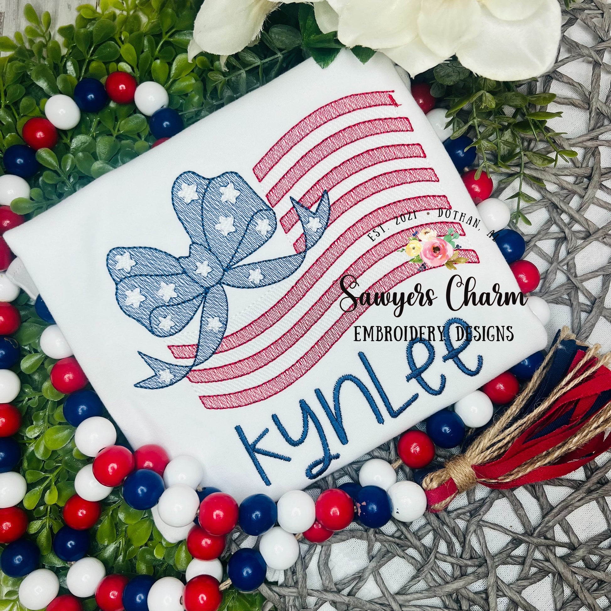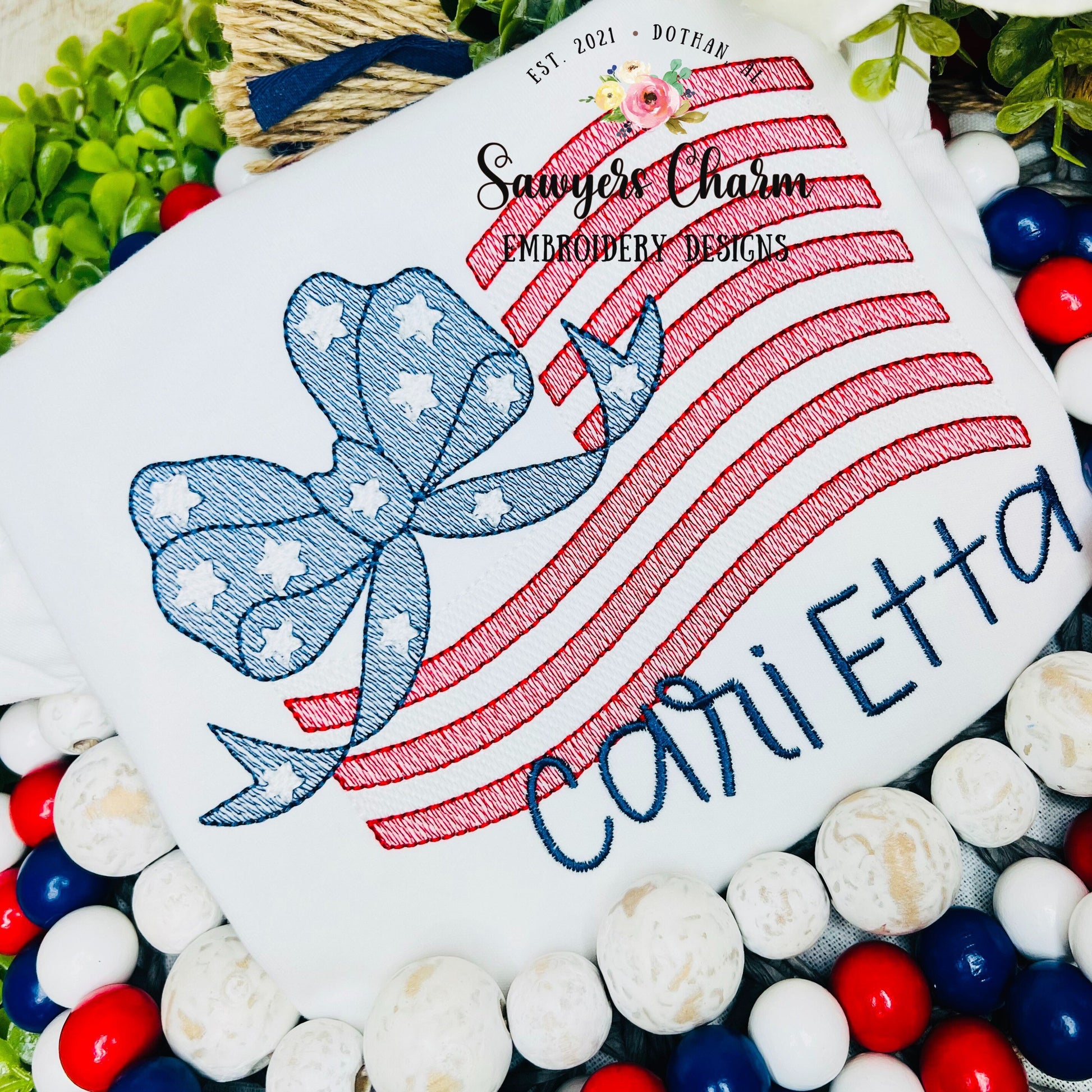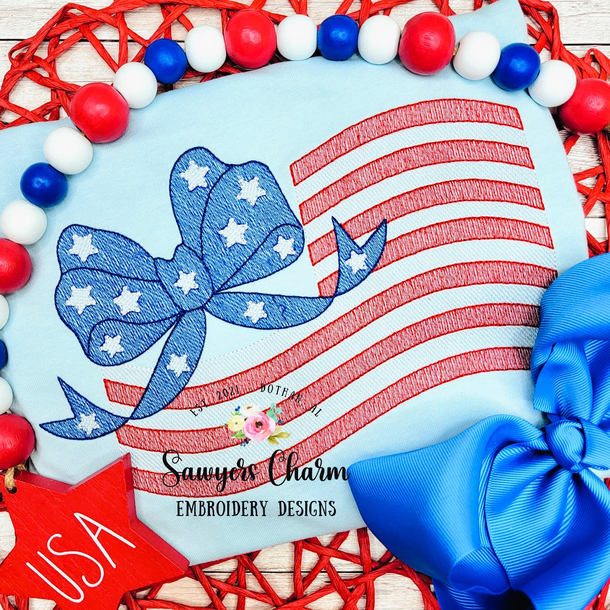 American flag with bow sketch stitch machine embroidery design file, bean stitch, 4th of July, patriotism, stars & stripes, girl, summer