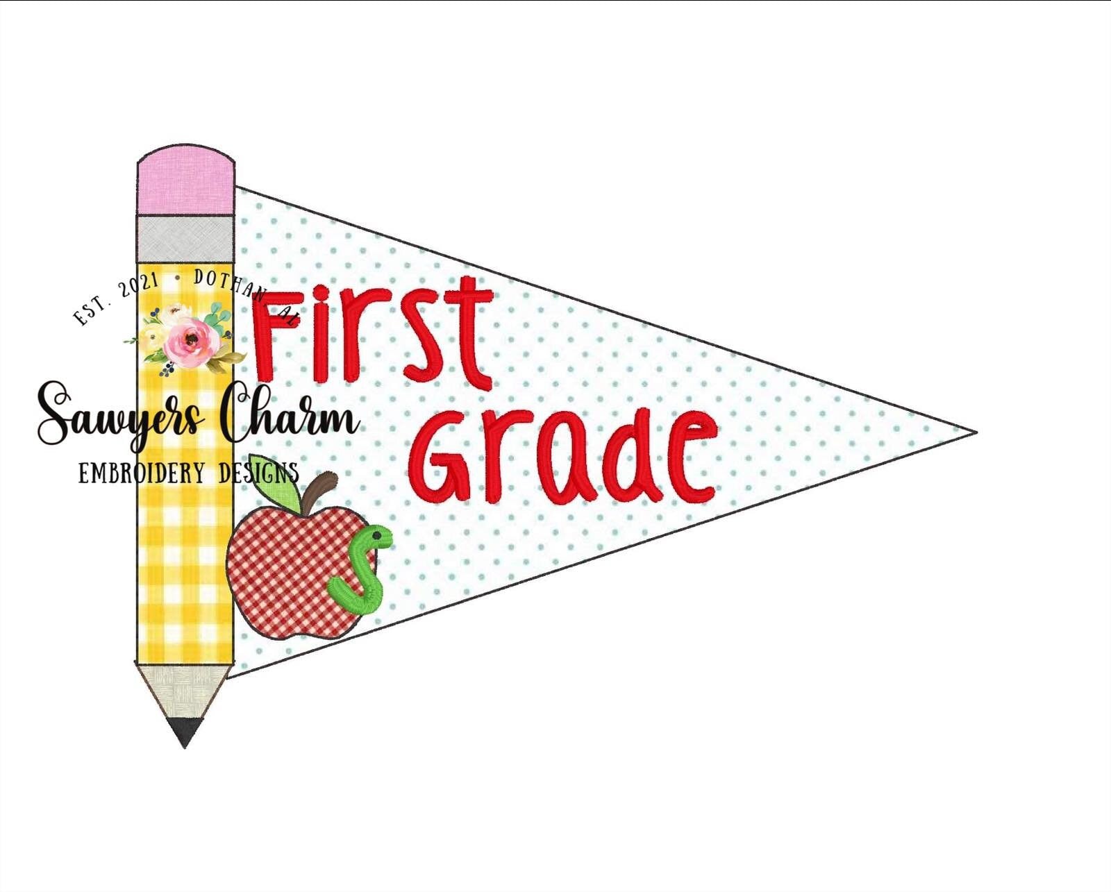 This embroidery file comes in 2 sizes.....5x7 and 8x8. Font is NOT included. This design is so precious and has so many possibilities. Works for both boys and girls depending on colors and fonts you use. You could add the grades, First Day of School, or names. This would make a cute little banner to add to a dowel rod for them to hold for First Day of School pictures. :)