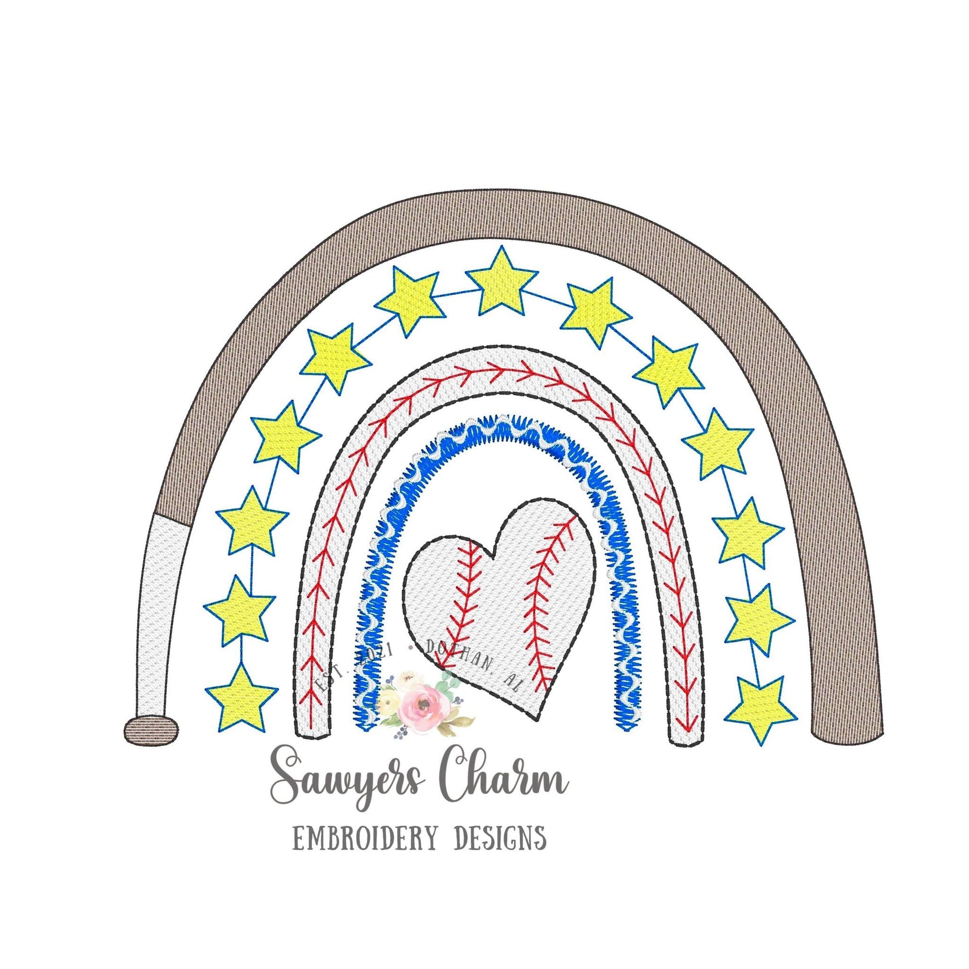 This embroidery file comes in 3 sizes....5x4, 5x7, and 8x8. You are purchasing the baseball version of the rainbow with the bat and stars sketch stitch rainbow. This is not a fill stitch design and the stitches are looser and show up better on a light color. The ball is shaped like a heart. The design has bean stitch finishing details.