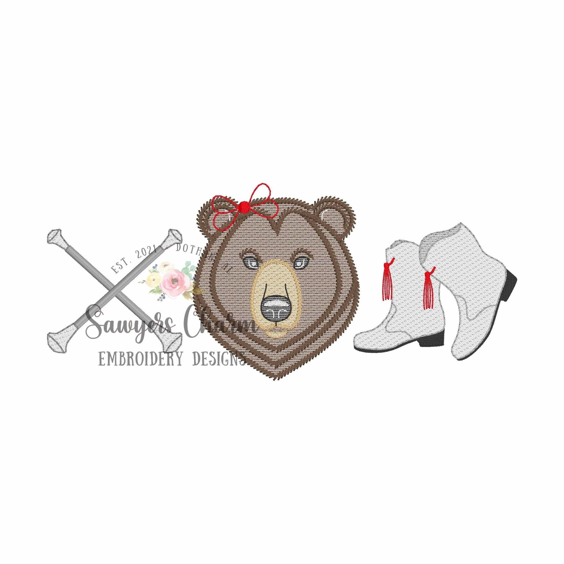 Batons, bear with bow, majorette boots trio, sketch stitch embroidery design, college university, football cheerleader, dance, coquette