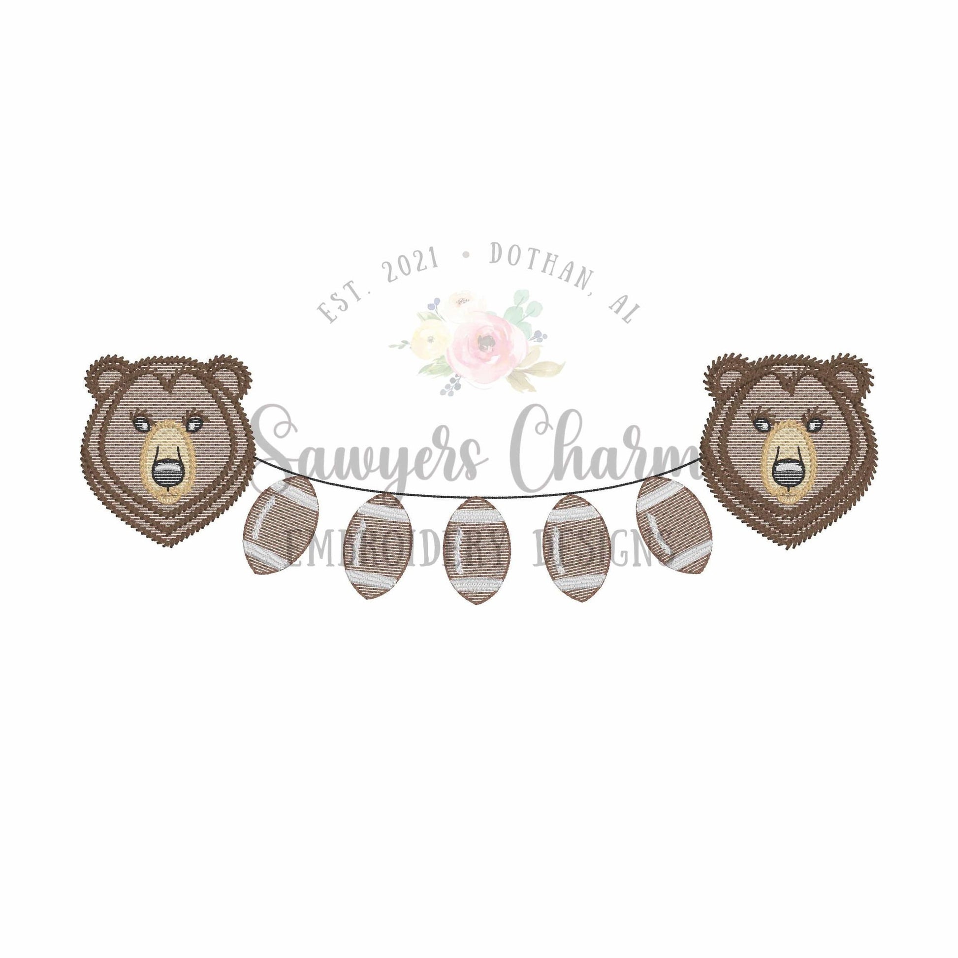 Bear & footballs bunting banner, sketch stitch machine embroidery design, college university mascot, fall sports fan, grizzly, quick stitch