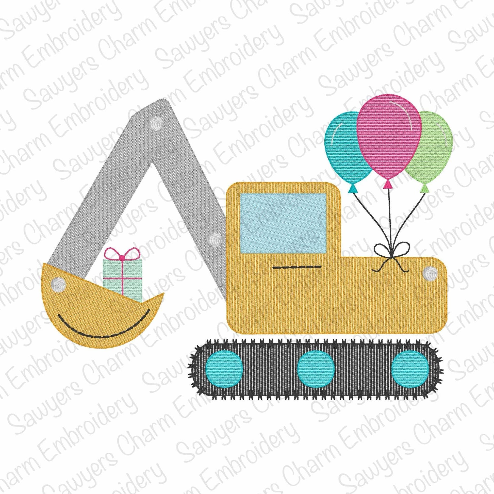 Birthday party excavator with balloons & gift/present sketch stitch machine embroidery design, construction, transportation, city vehicle