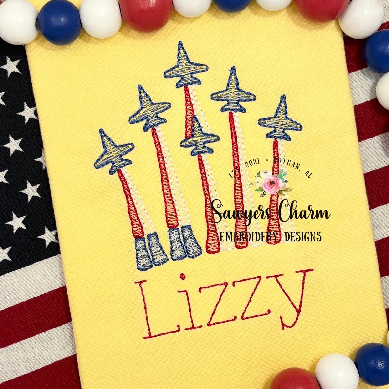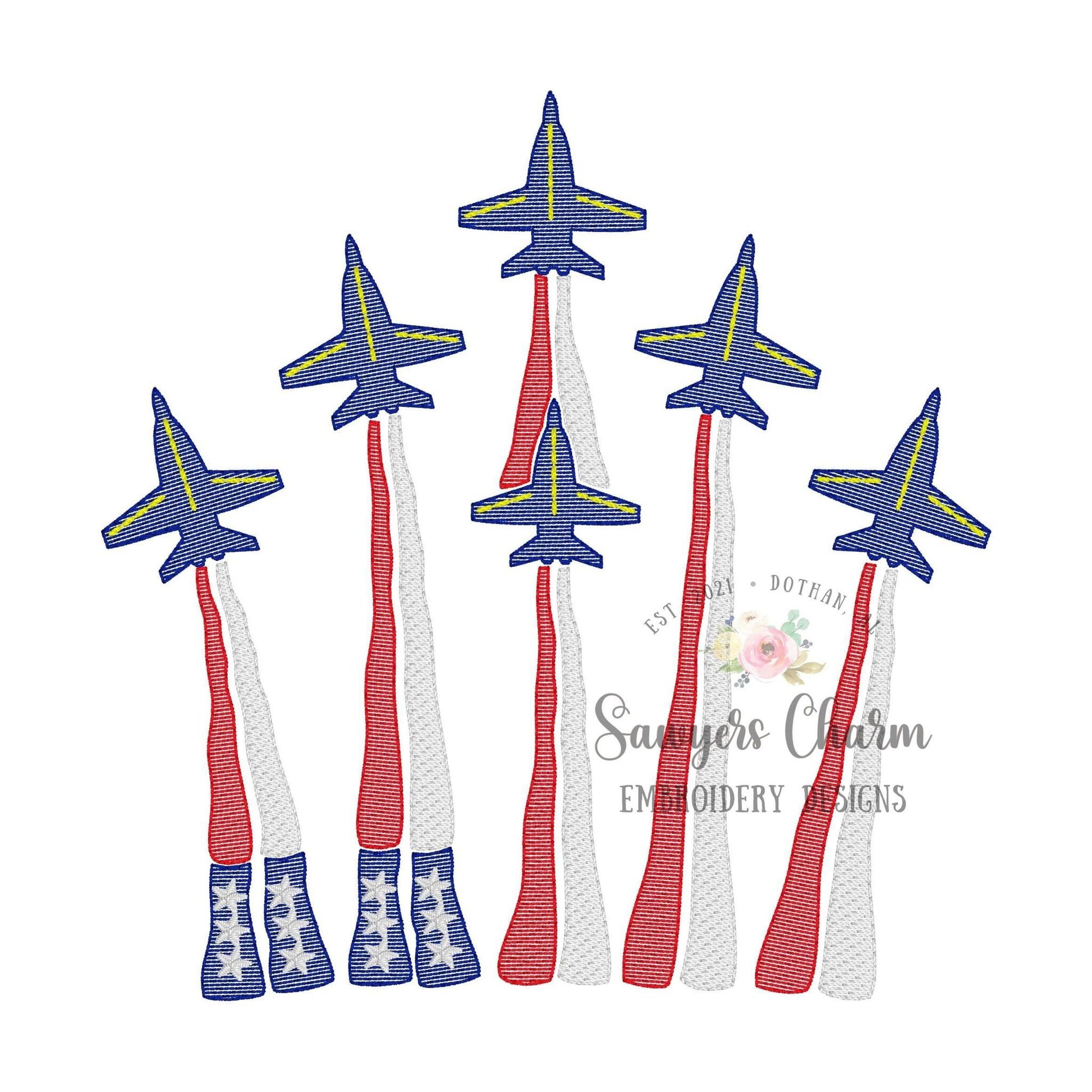 Blue jets, stars/stripes, flag smoke sketch stitch machine embroidery design file, 4th of July, patriotic, summer, America, air show