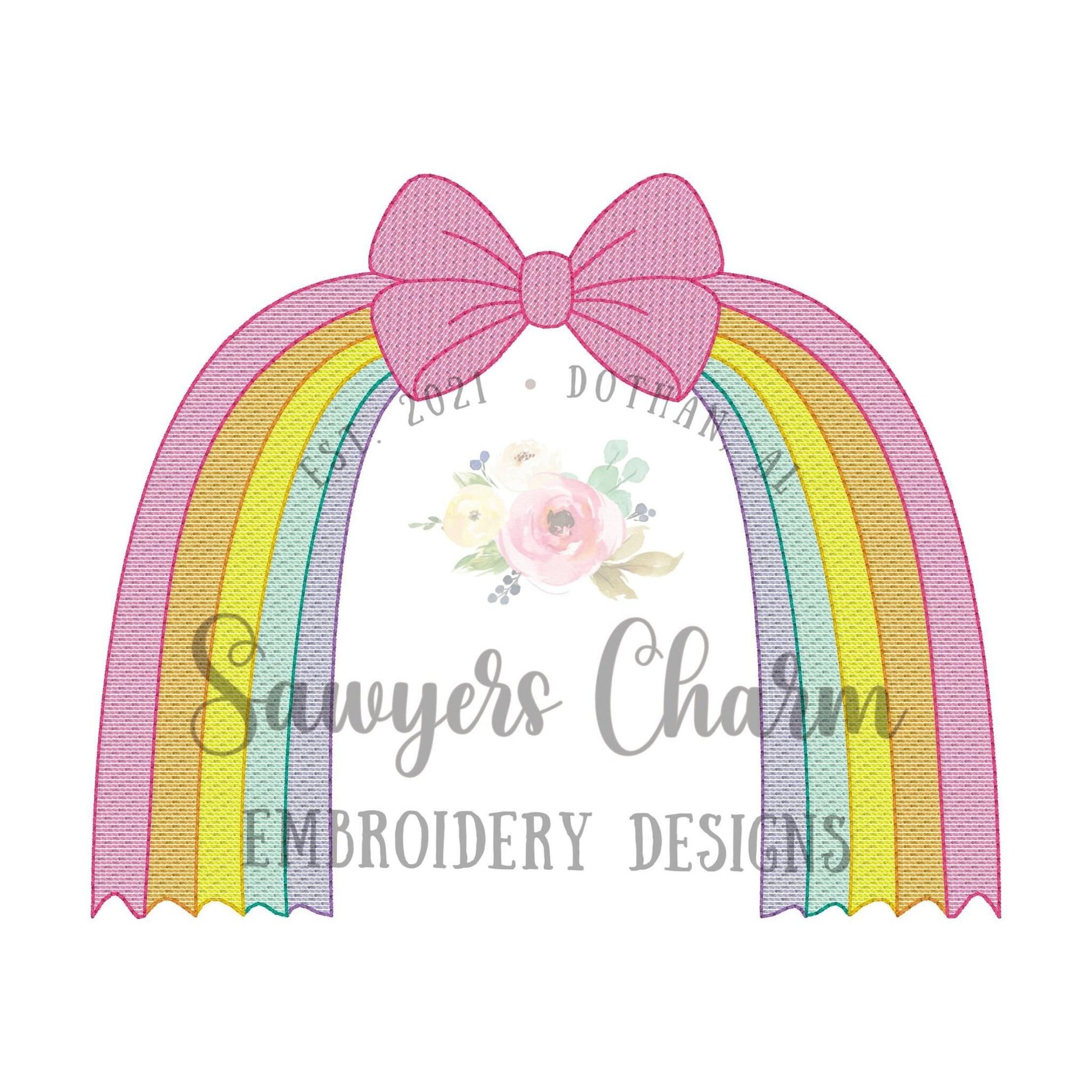 Boho bow with streamers rainbow sketch stitch machine embroidery design file, coquette, little girl, ribbons, bean stitch details, summer