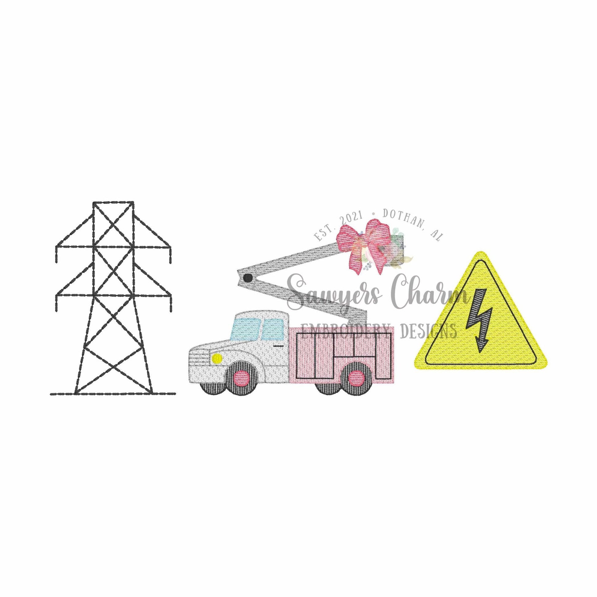 Bucket truck with bow, power line, hazard sign sketch stitch trio, machine embroidery design, quick stitch, lineman, construction worker