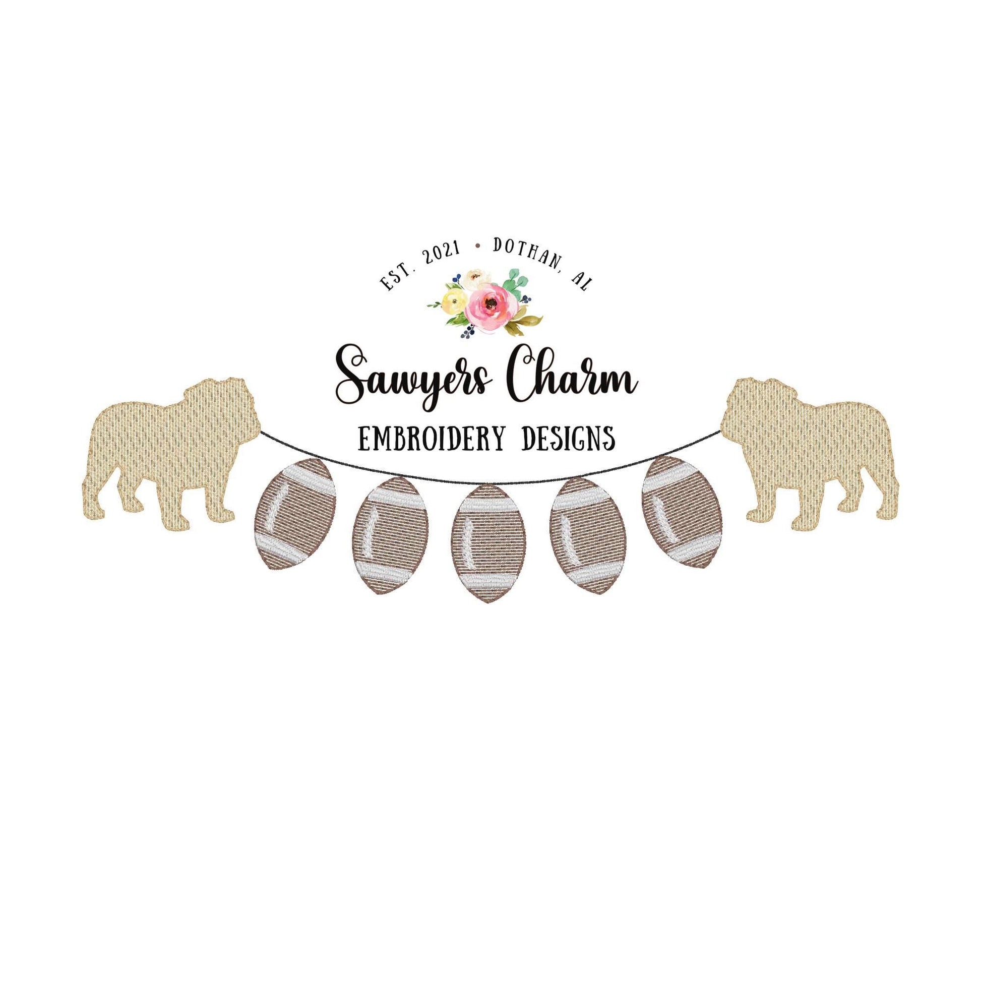 This embroidery file comes in 4 sizes.....5 inch wide, 6 inch wide, 5x7 and 8x8. You are getting the bulldog with footballs bunting banner. It is a light fill sketch stitch embroidery design with bean stitch finishing details.