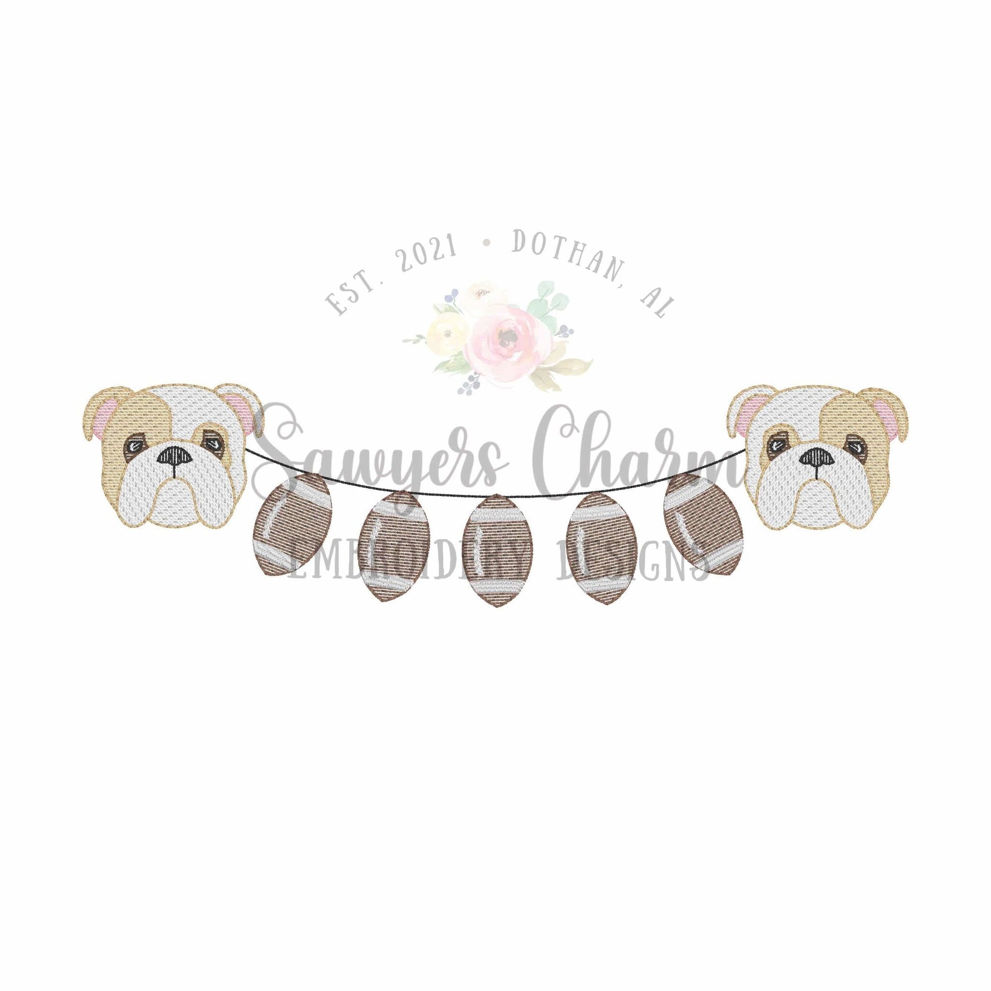 Bulldog two colors & footballs bunting banner sketch stitch machine embroidery design, college university, sports fan, mascot, high school
