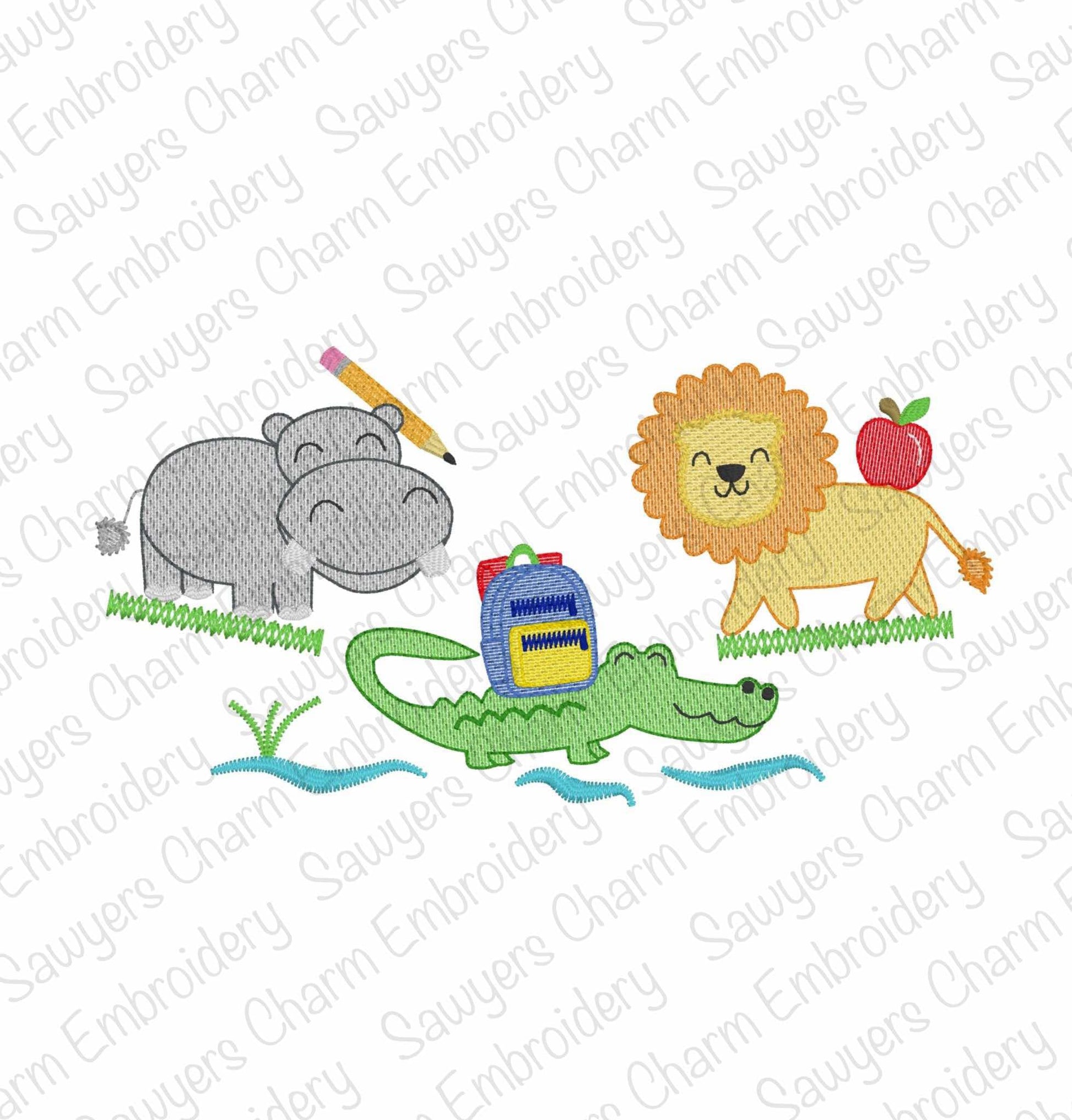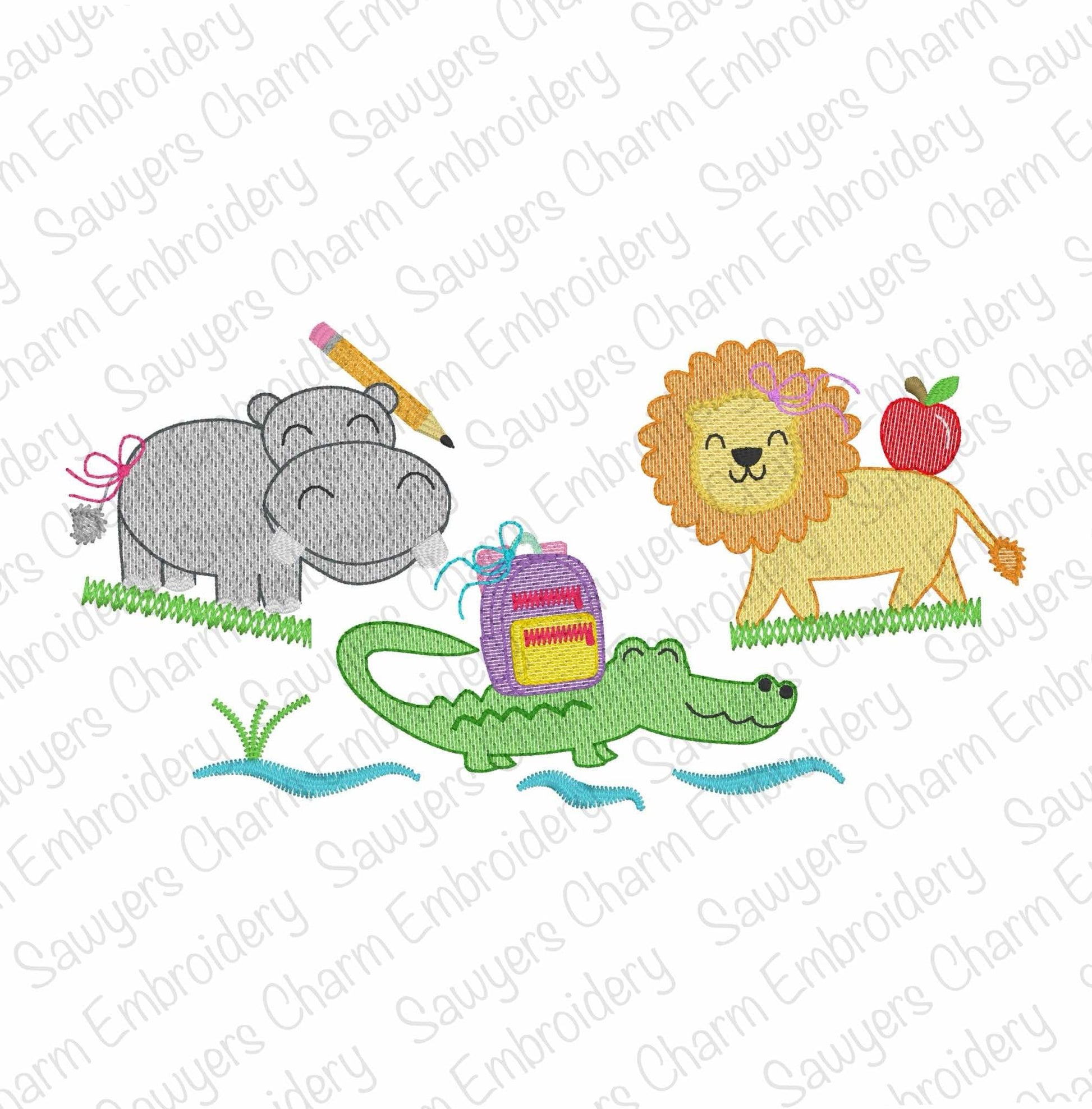 BUNDLE Back to school Zoo/jungle/safari animals with/without bows sketch stitch trio, machine embroidery design, hippo, alligator, lion