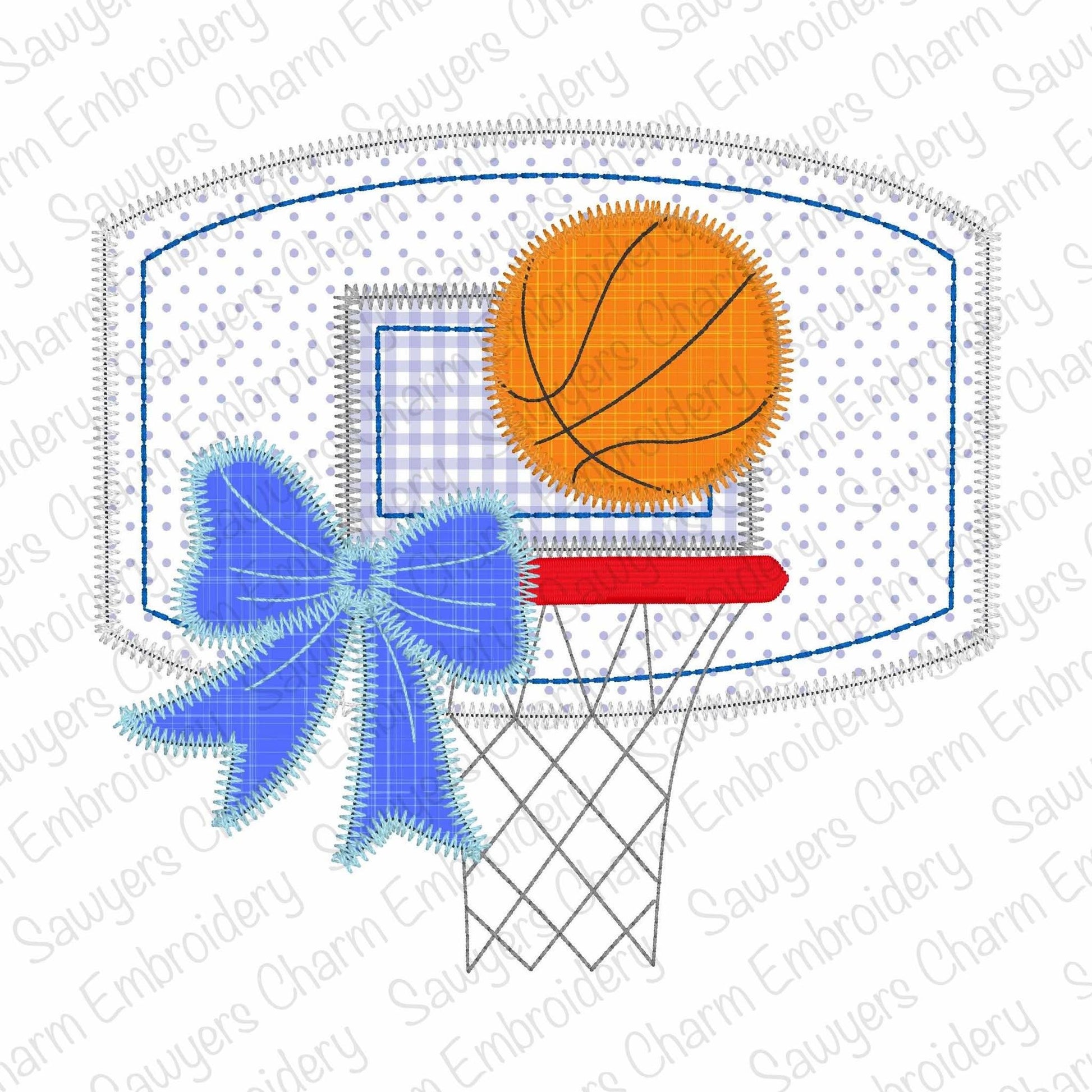 BUNDLE basketball goal plate with coquette bow machine embroidery design file, bean & zig zag stitch, quick stitch, sports fan game day, net