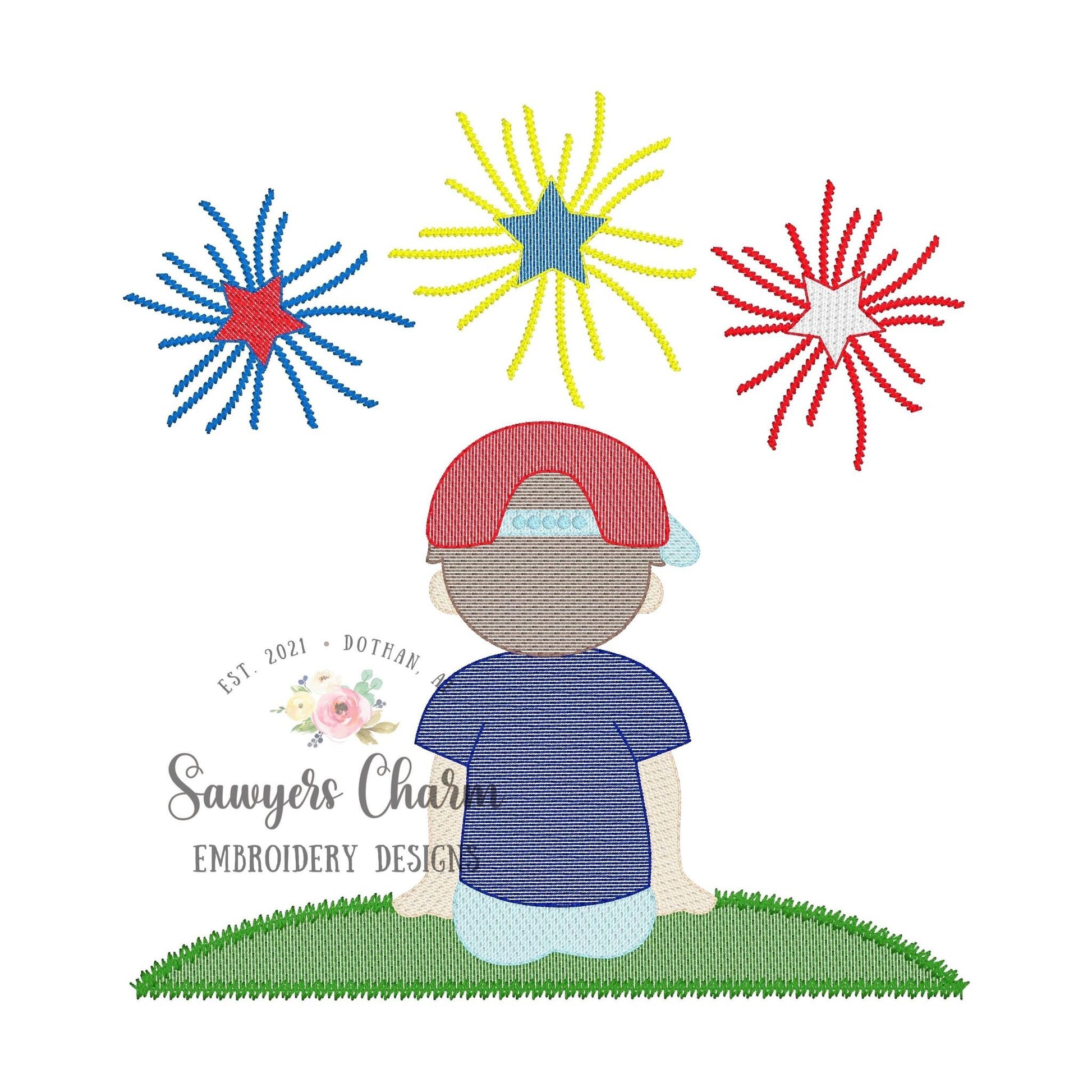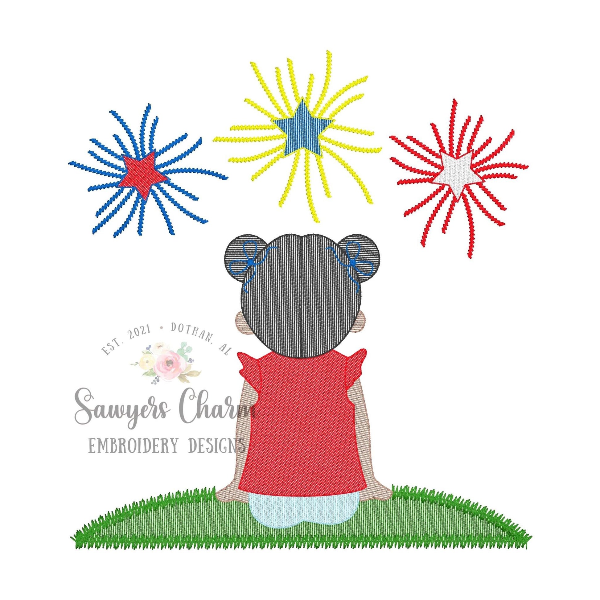 BUNDLE Boy with hat and Girl with pigtails/buns/bow watching fireworks, sketch stitch machine embroidery design file, July 4th, Memorial Day
