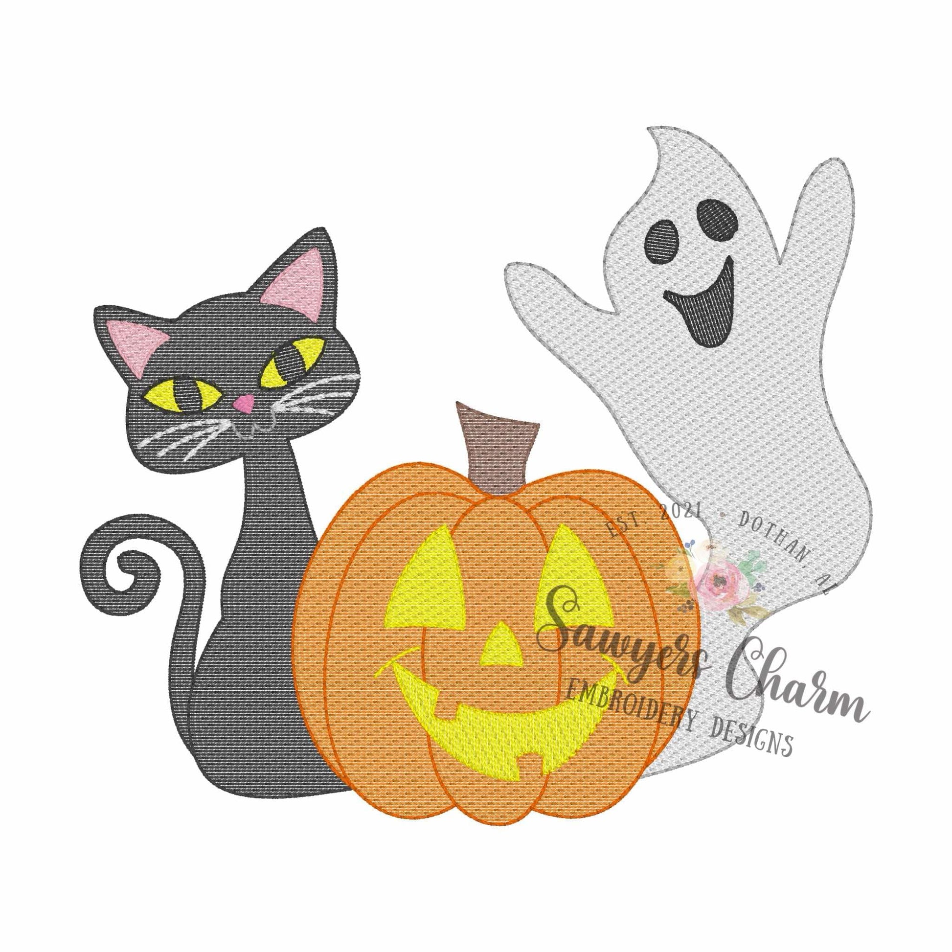 BUNDLE Cat, jackolantern, ghost sketch stitch trio machine embroidery design, Halloween, spooky season, quick stitch, fall, includes bow