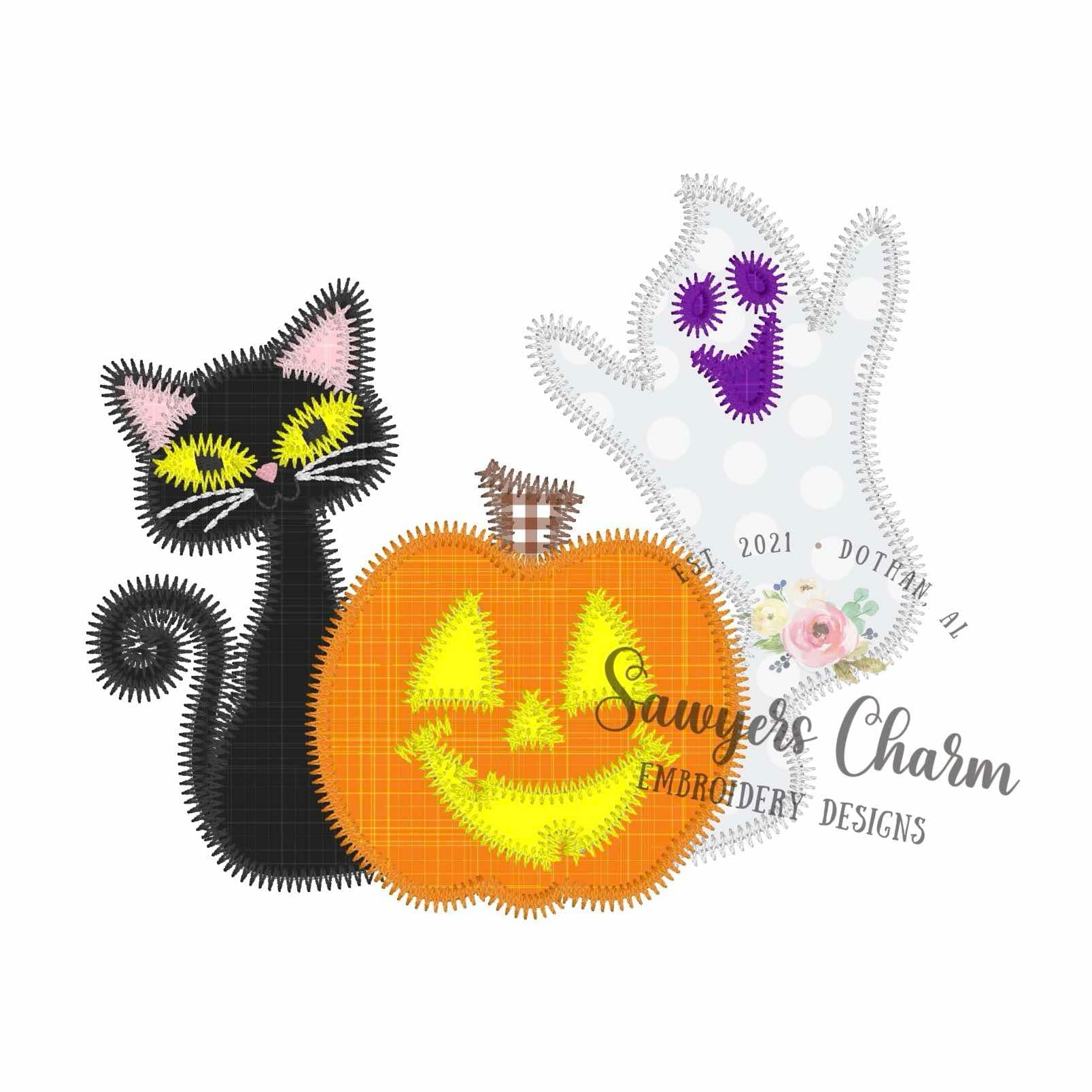 BUNDLE Cat, jackolantern, ghost zigzag stitch trio machine applique embroidery design, Halloween, spooky season, fall, includes coquette bow
