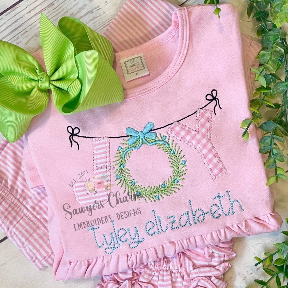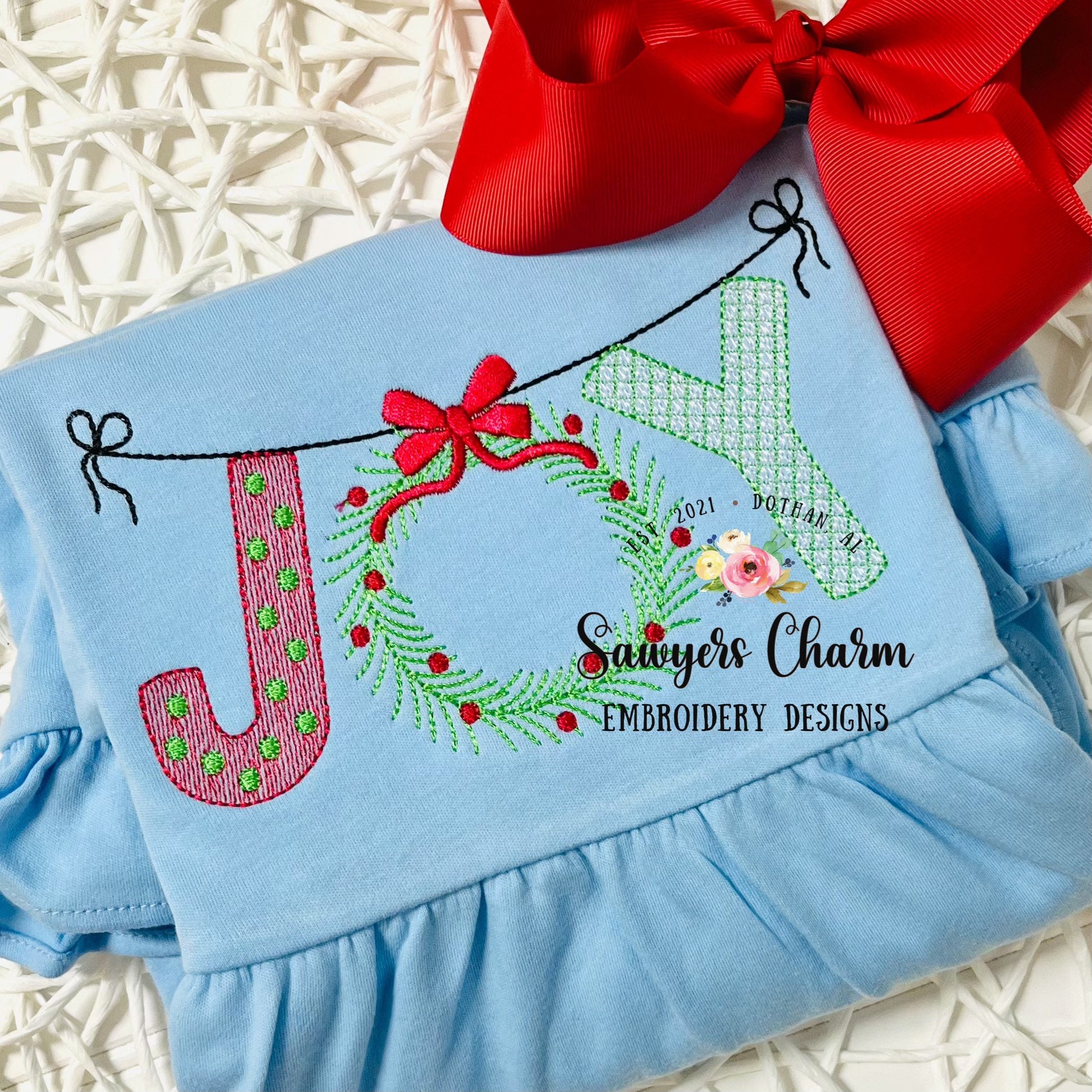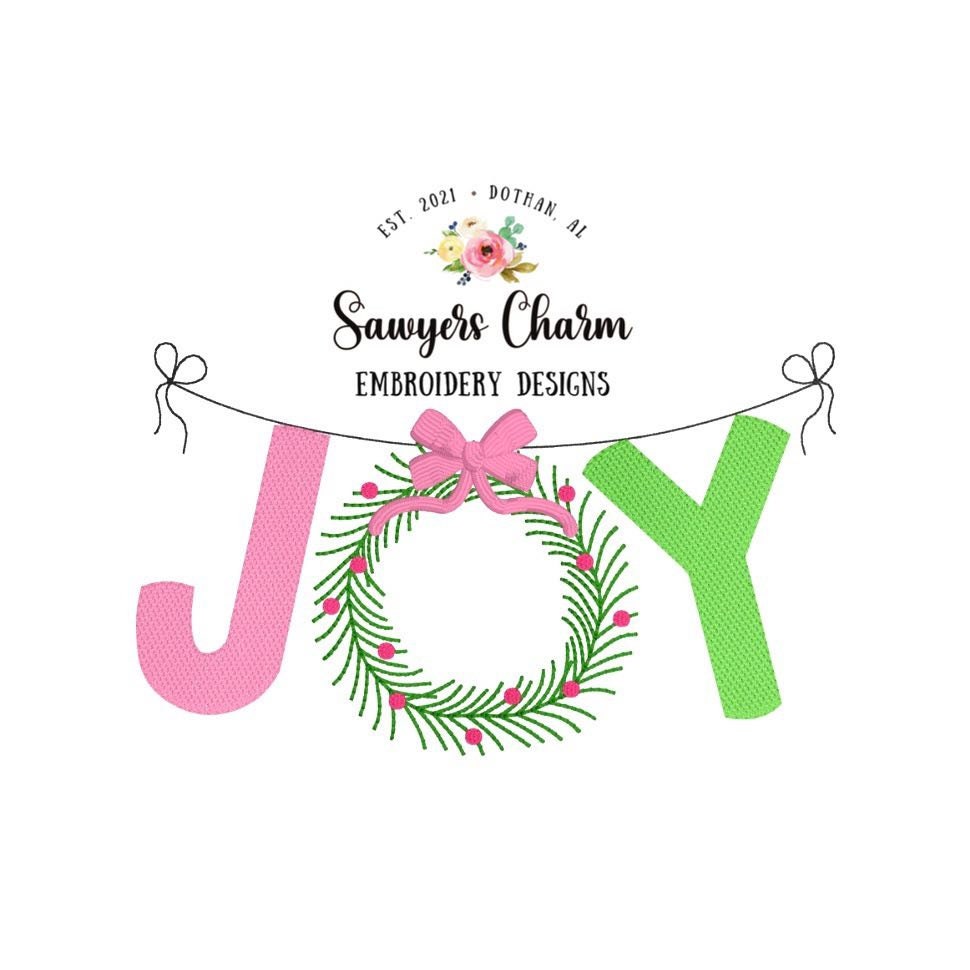 This embroidery file comes in 3 sizes.....5x3, 5x7 and 8x8. You are purchasing the bundle of 3 different JOY bunting banner embroidery designs. You will be getting the zigzag applique version, sketch stitch version, and the decorative sketch stitch version. The wreath is a bean stitch with satin stitch bow. The J and Y are applique or sketch stitch.