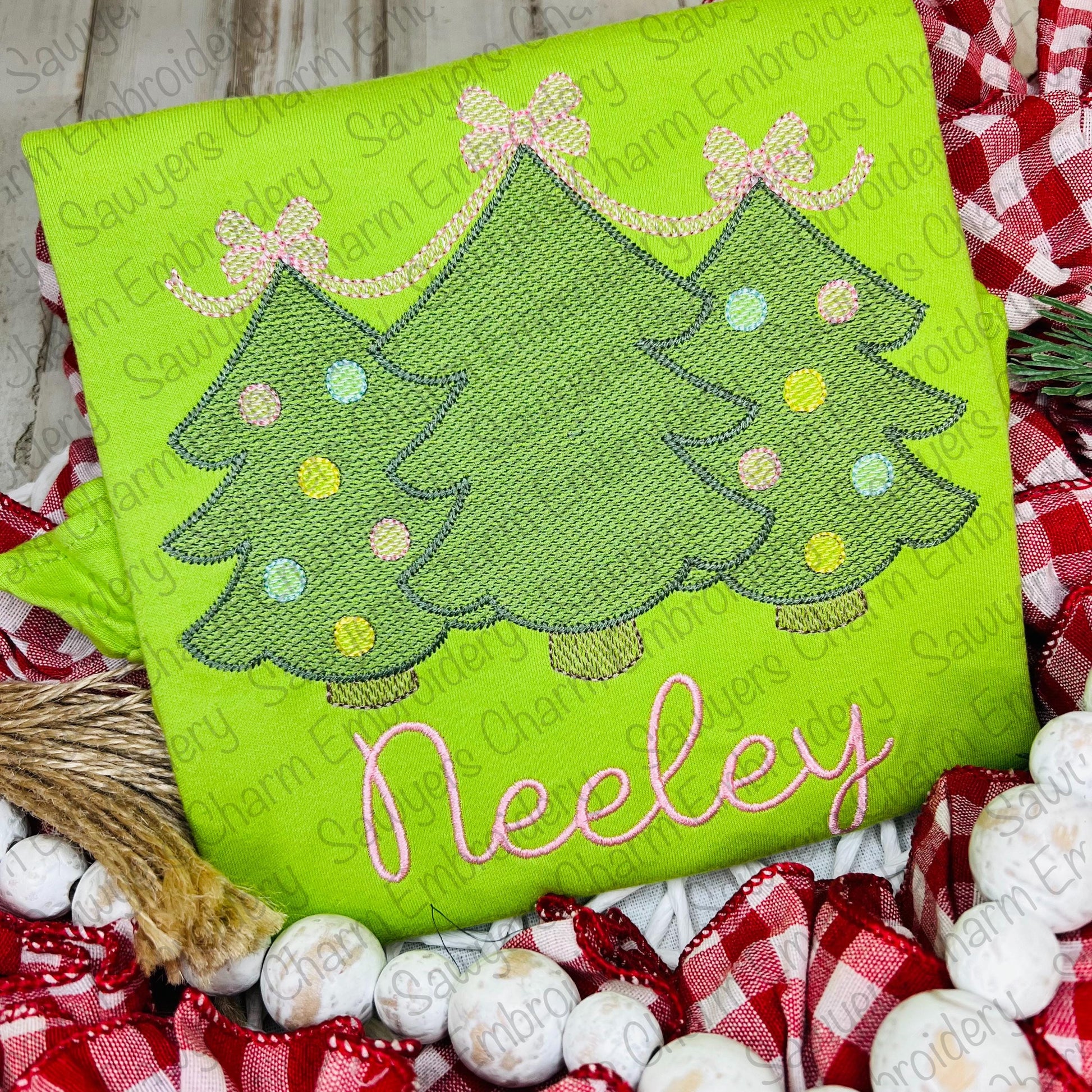 This embroidery file comes in 4 sizes.....4x4, 6x4, 5x7 and 8x8. This is perfect for boys or girls depending on font used for name and colors. :) You will be getting the light fill sketch stitch Christmas trees with bows and with stars. These sketch stitch designs look best on light colored or white items. If you use a dark item, you can use HTV (heat transfer vinyl) under the stitching to make the colors pop. If you need a tutorial you can find lots online.