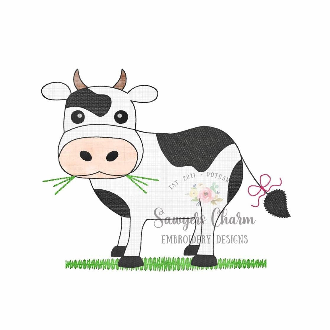 BUNDLE Cow in grass with & without bow bean stitch applique, machine embroidery design file, quick stitch, farm animals in field, hay, bull
