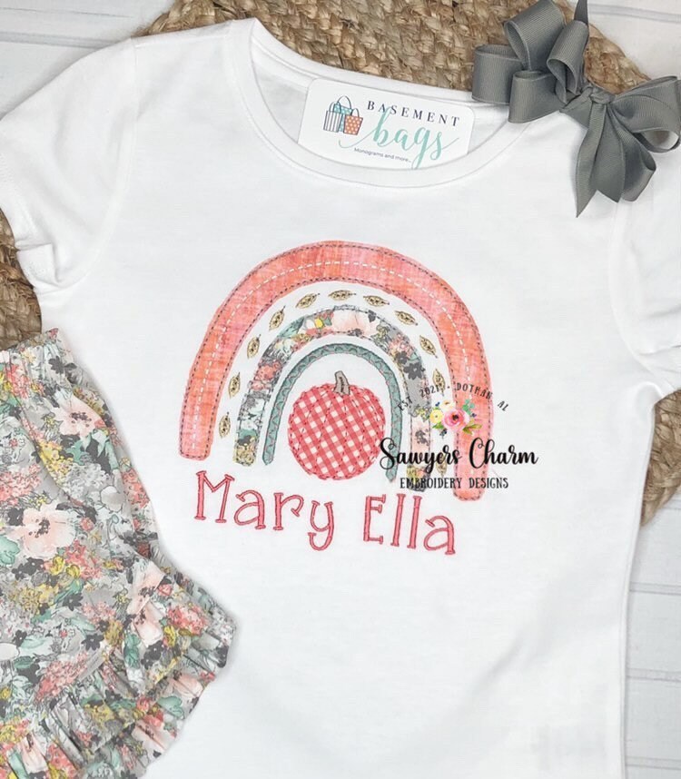 This embroidery file comes in 2 sizes.....5x7 and 8x8. This is a bundle of the fall rainbow design. You will be getting both sizes in the sketch fill design AND applique design. :) Font is NOT included.