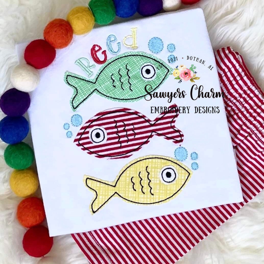 This embroidery file comes in sizes.....5x4, 5x7, and 8x8. This is the bundle of fish appliques that include zig zag stitch and bean stitch. The bubbles are a fill stitch.