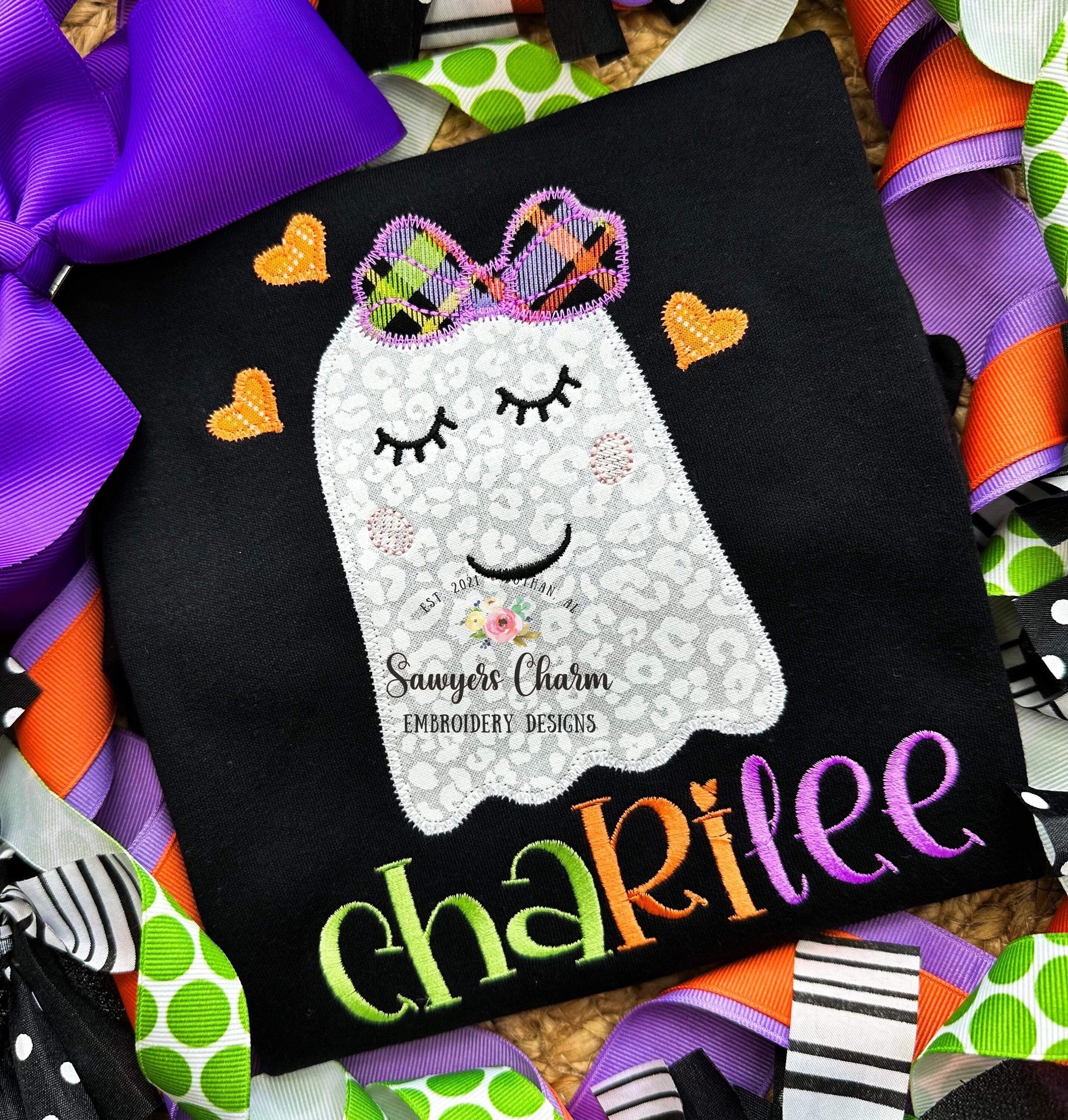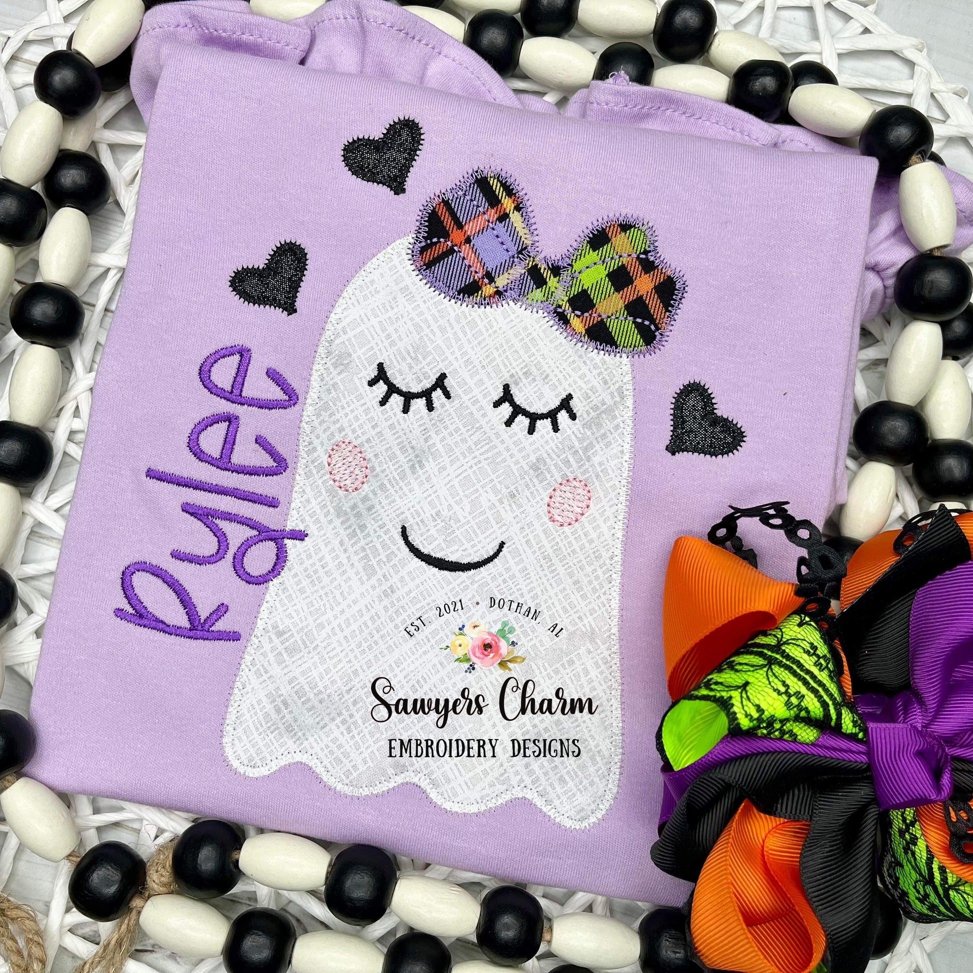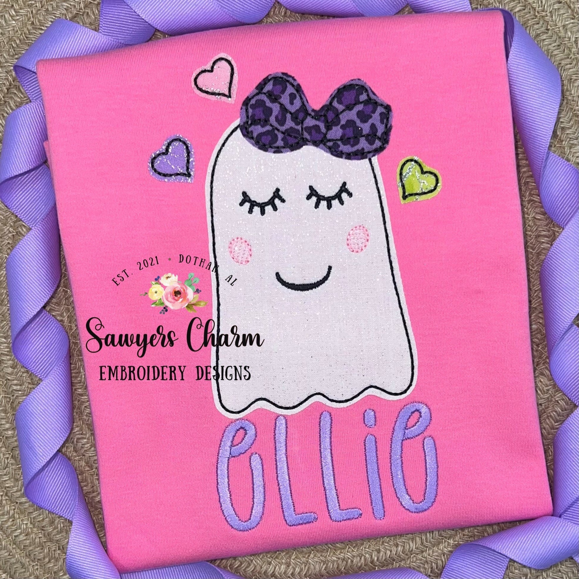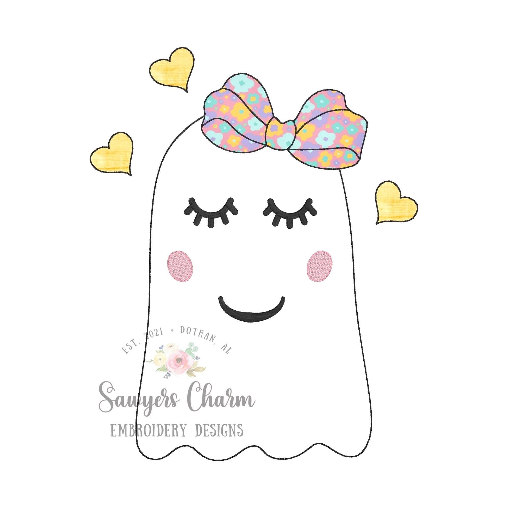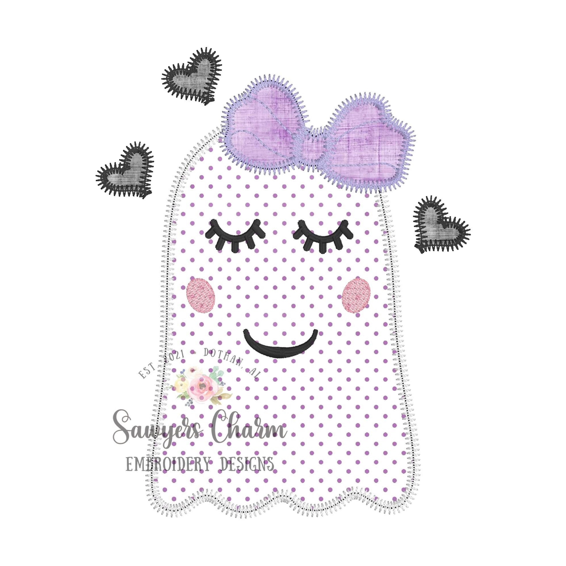 BUNDLE Ghost with bow and hearts zig zag & bean stitch applique machine embroidery design file, quick stitch, fall, halloween, spooky season