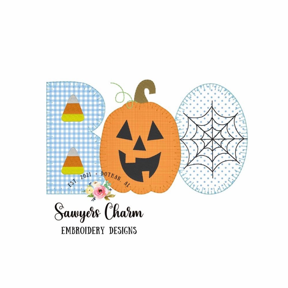 This embroidery file comes in 4 sizes.....4x4, 5x3, 5x7, and 8x8. This is a bundle of the blanket stitch applique BOO design. It comes with and without a bow for boys and girls.