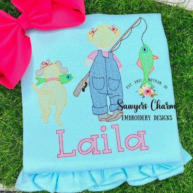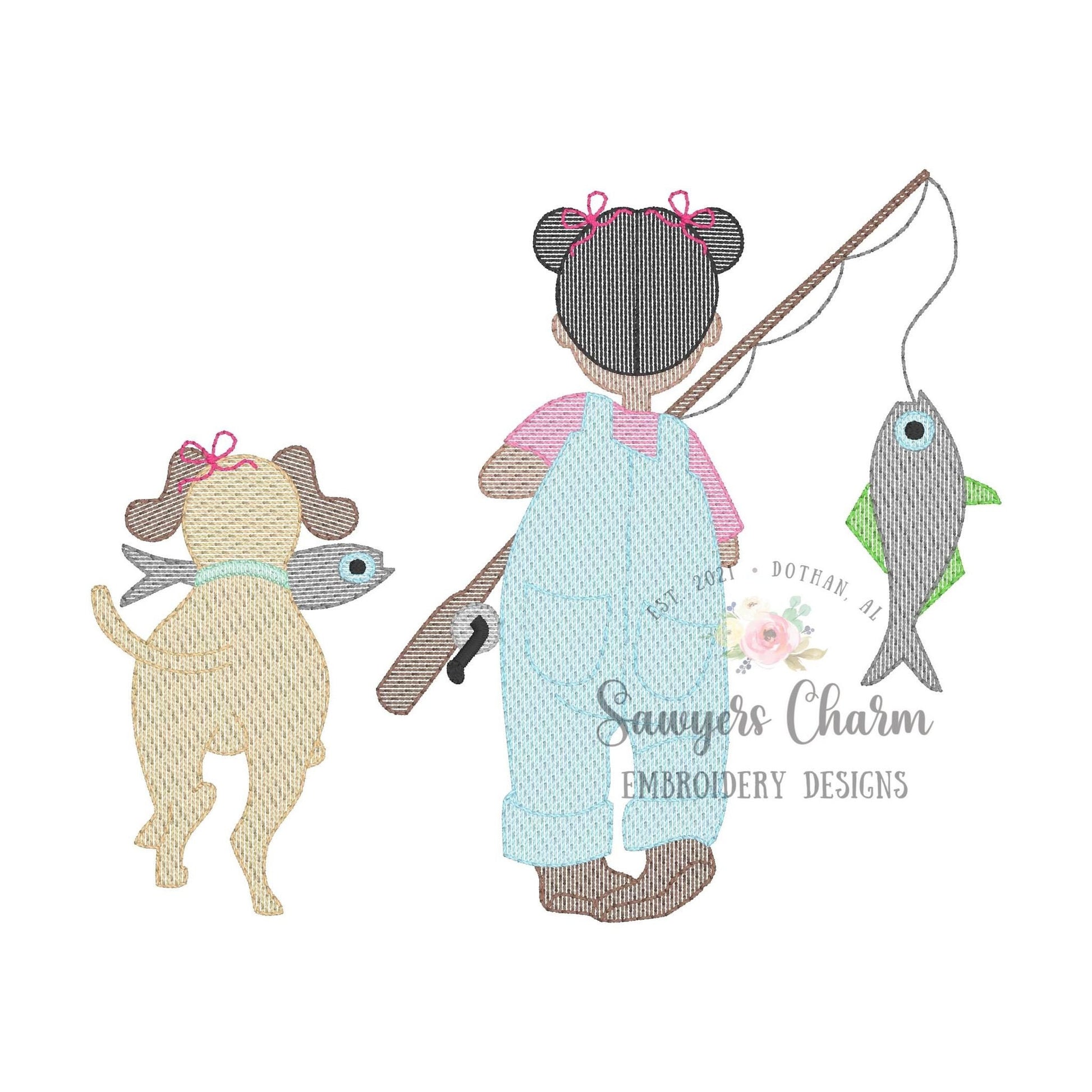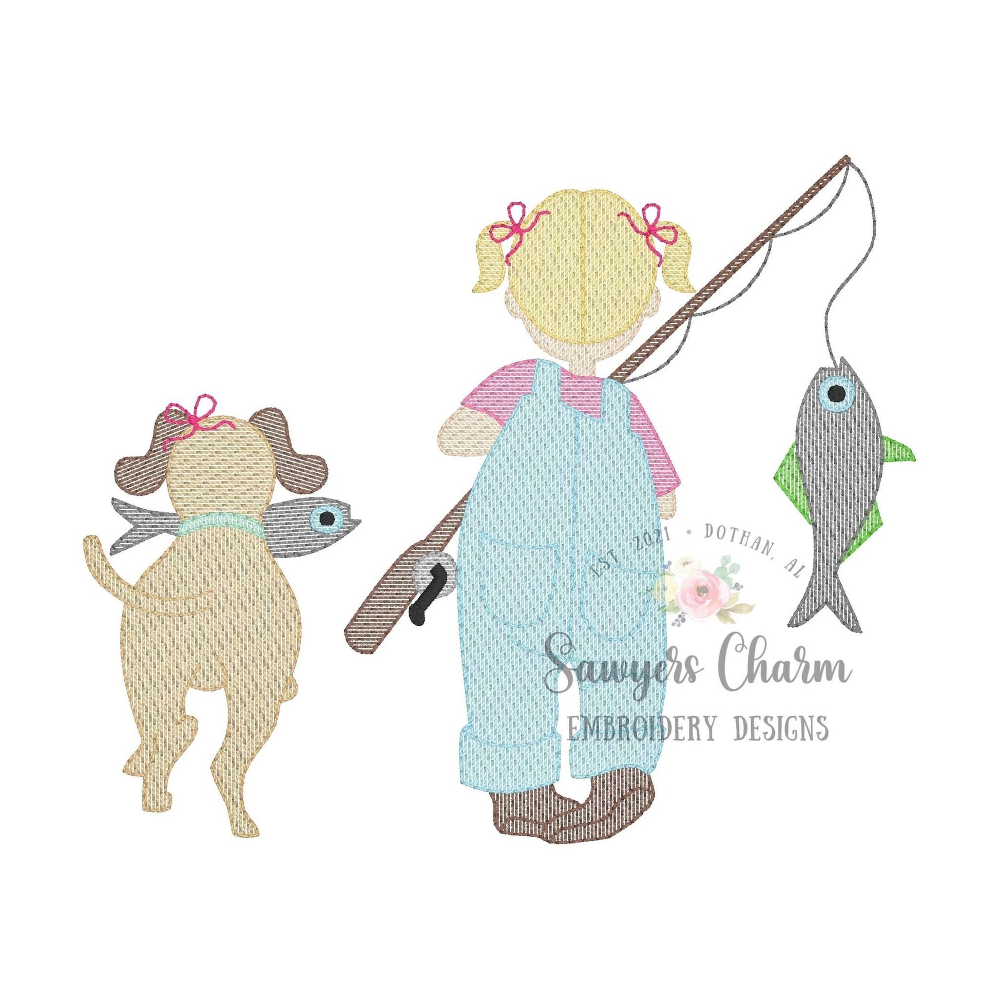 BUNDLE Little girl AND boy fishing with dog sketch stitch machine embroidery design file, fishing pole, spring summer, quick stitch, outdoor