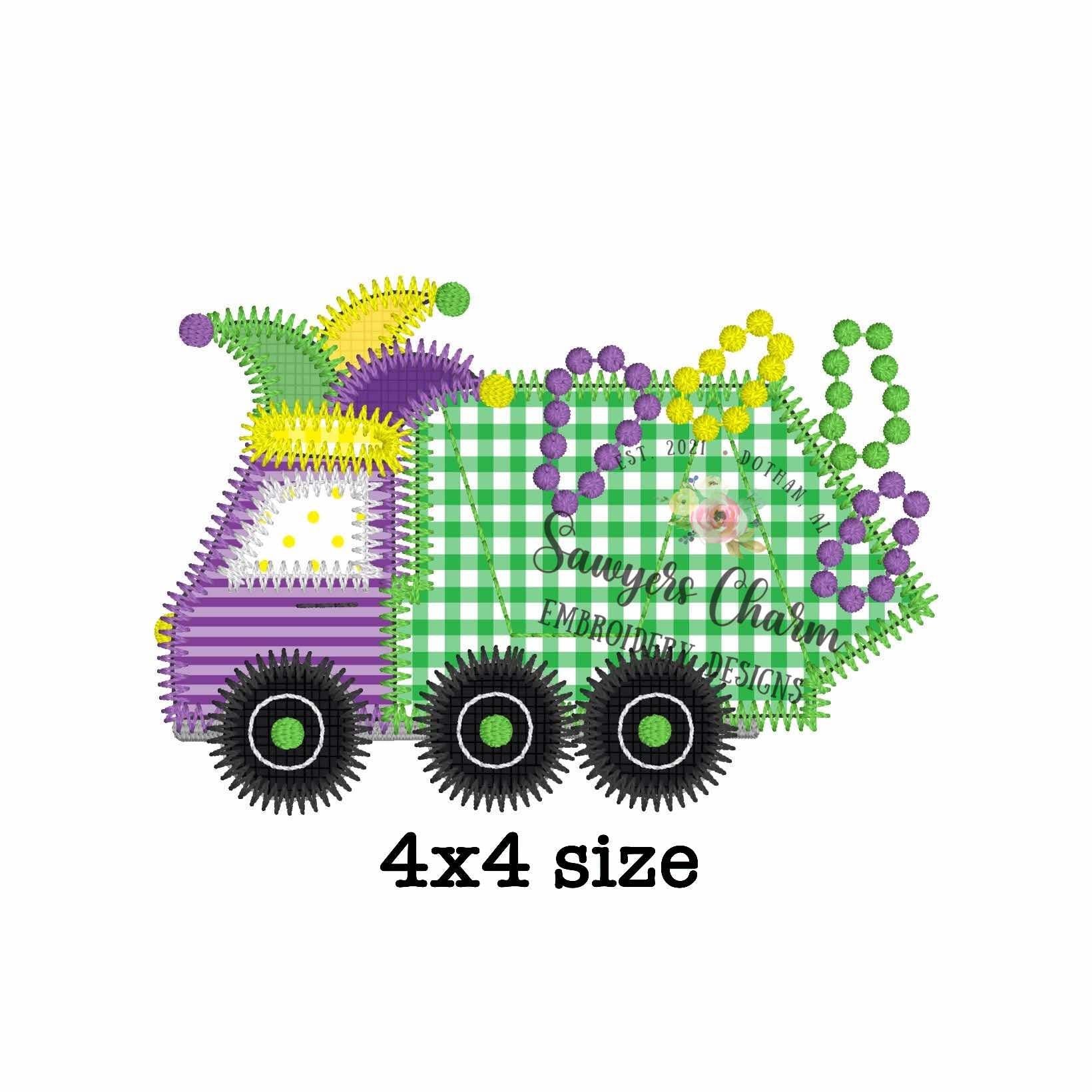 BUNDLE Mardi gras garbage truck with beads/jester hat bean & zig zag stitch machine applique embroidery design, quick stitch, party, parade