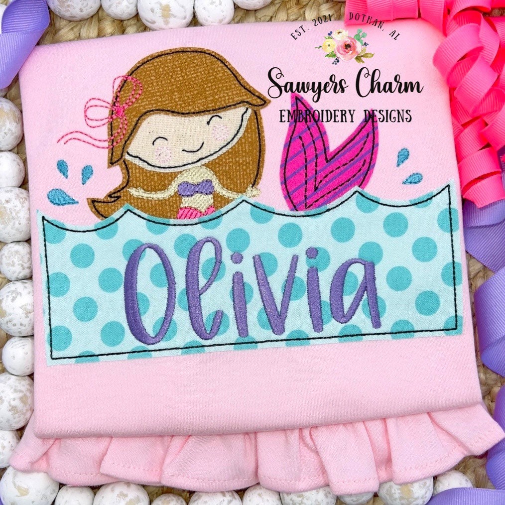 BUNDLE Mermaid jumping out of water with name plate zig zag & bean stitch machine embroidery design file, quick stitch, bow, ocean beach
