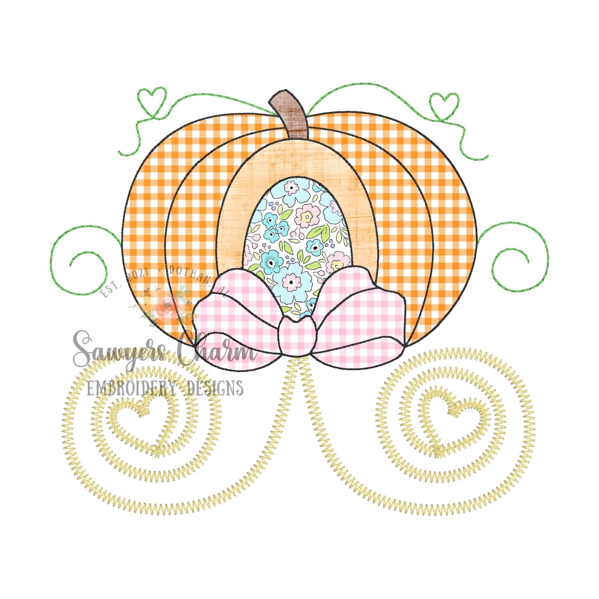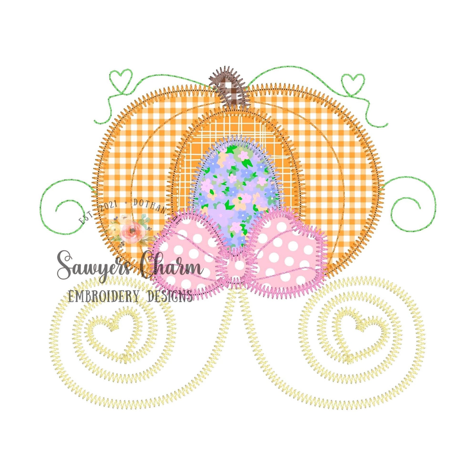 BUNDLE Pumpkin princess carriage with bow bean & zigzag stitch applique, machine embroidery design file, halloween, fall pumpkin, girly girl