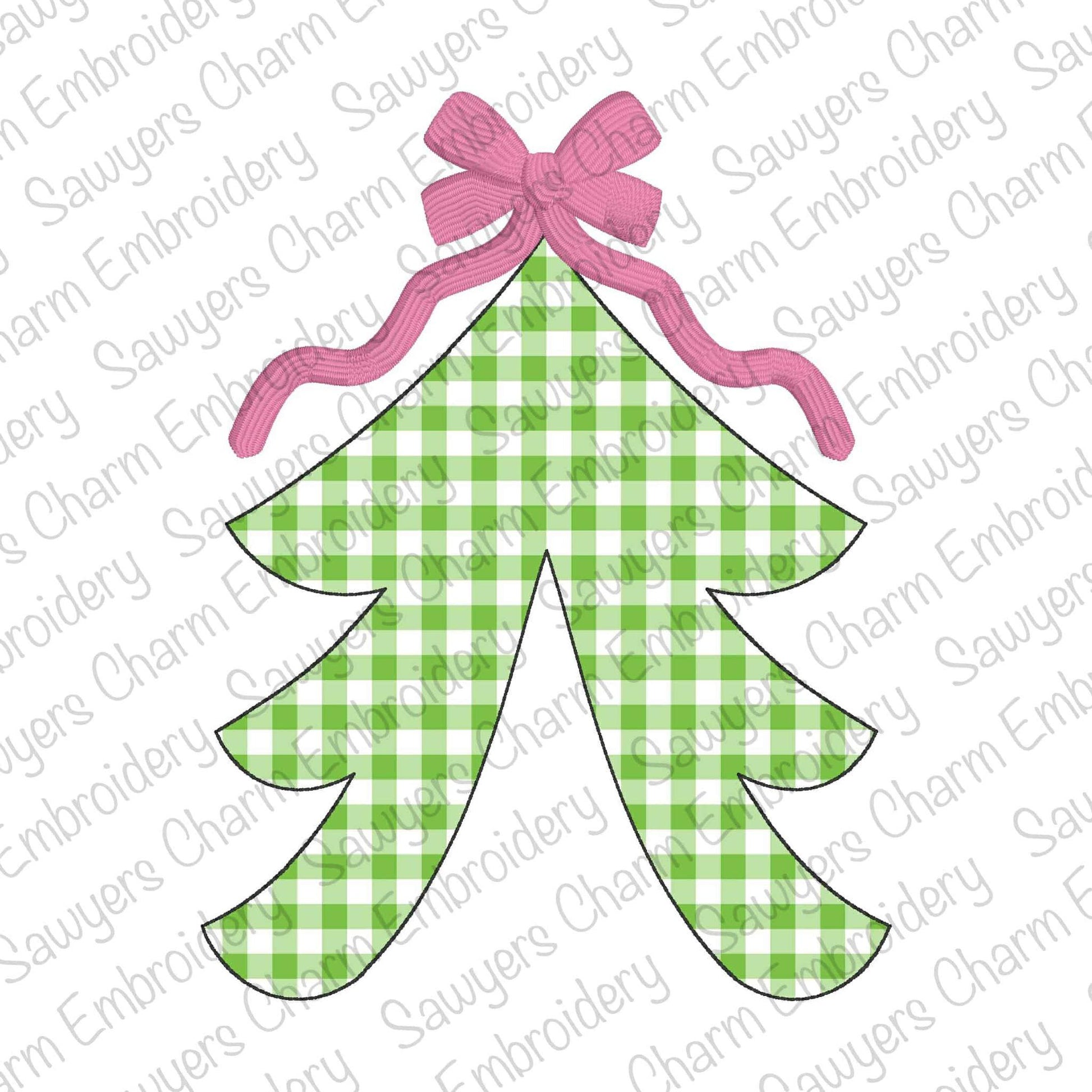 This embroidery file comes in 4 sizes....4x4 hoop, 5 inches tall, 6 inches tall, and 7 inches tall. This is a bundle that includes a bean stitch applique, zig zag stitch applique, and satin stitch applique. The bow is a satin stitch and the tree uses only one piece of fabric to make this such a quick stitch.