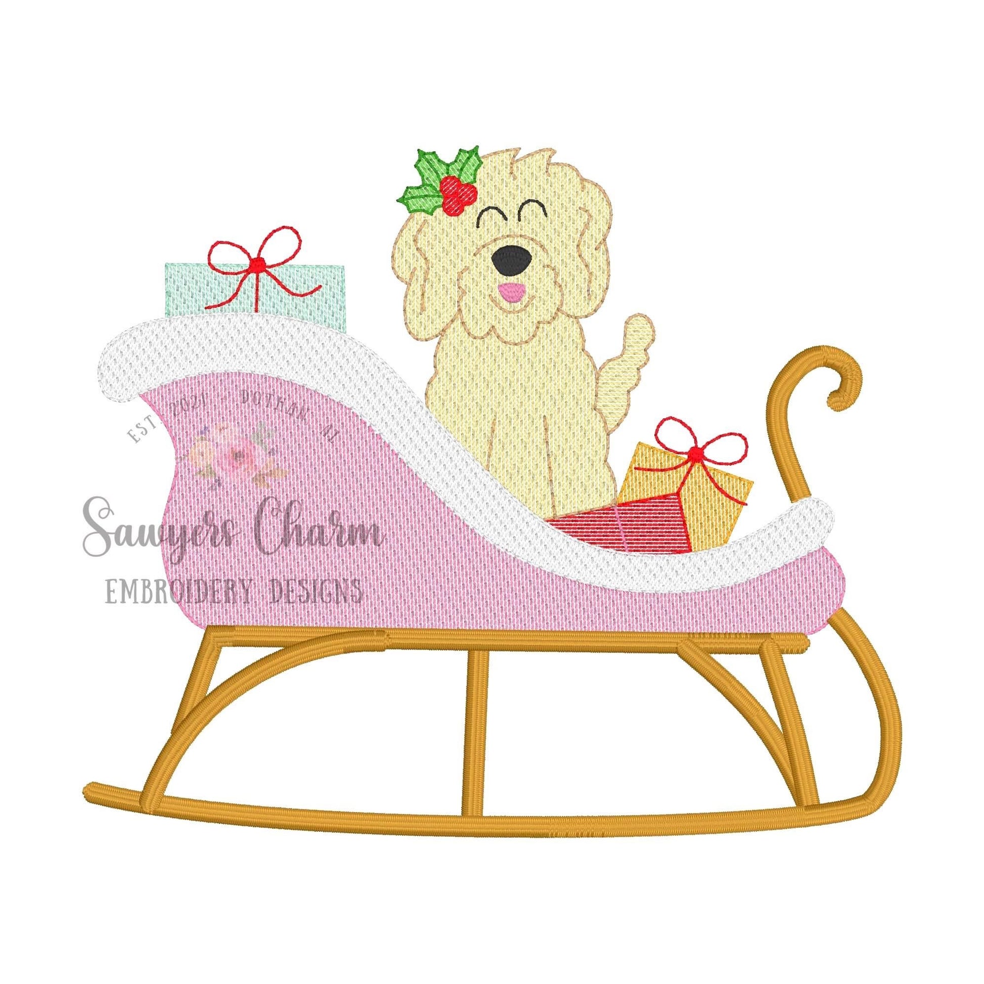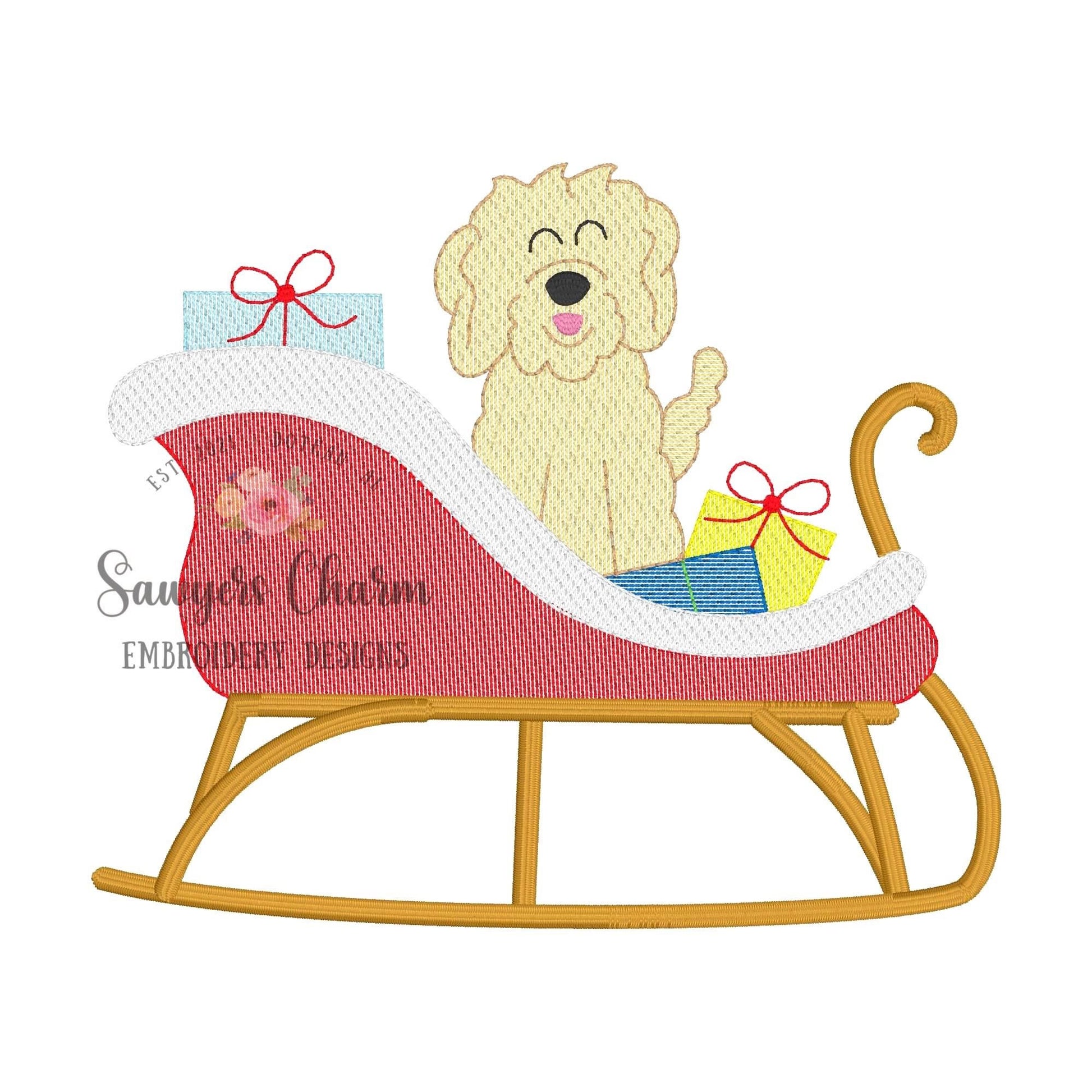 BUNDLE sleigh with (girl/boy) golden doodle & presents sketch stitch machine embroidery design file, holidays, Santa Claus, Merry Christmas