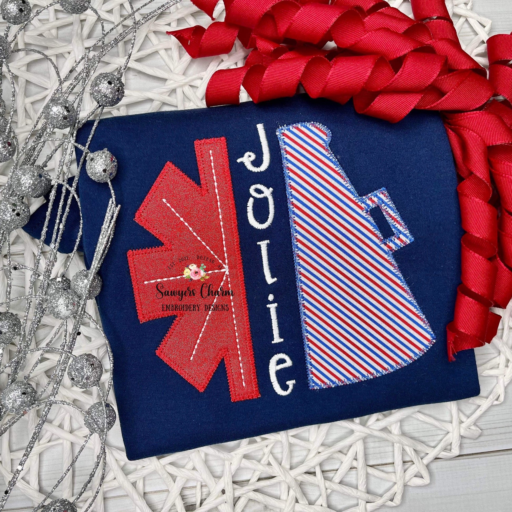This embroidery file comes in 3 sizes.....5x5, 6x6, and 8x8. This is the bundle that includes the bean stitch version and the zigzag stitch version of the applique. There is a space in the middle where a name or initials can be added vertically. :)