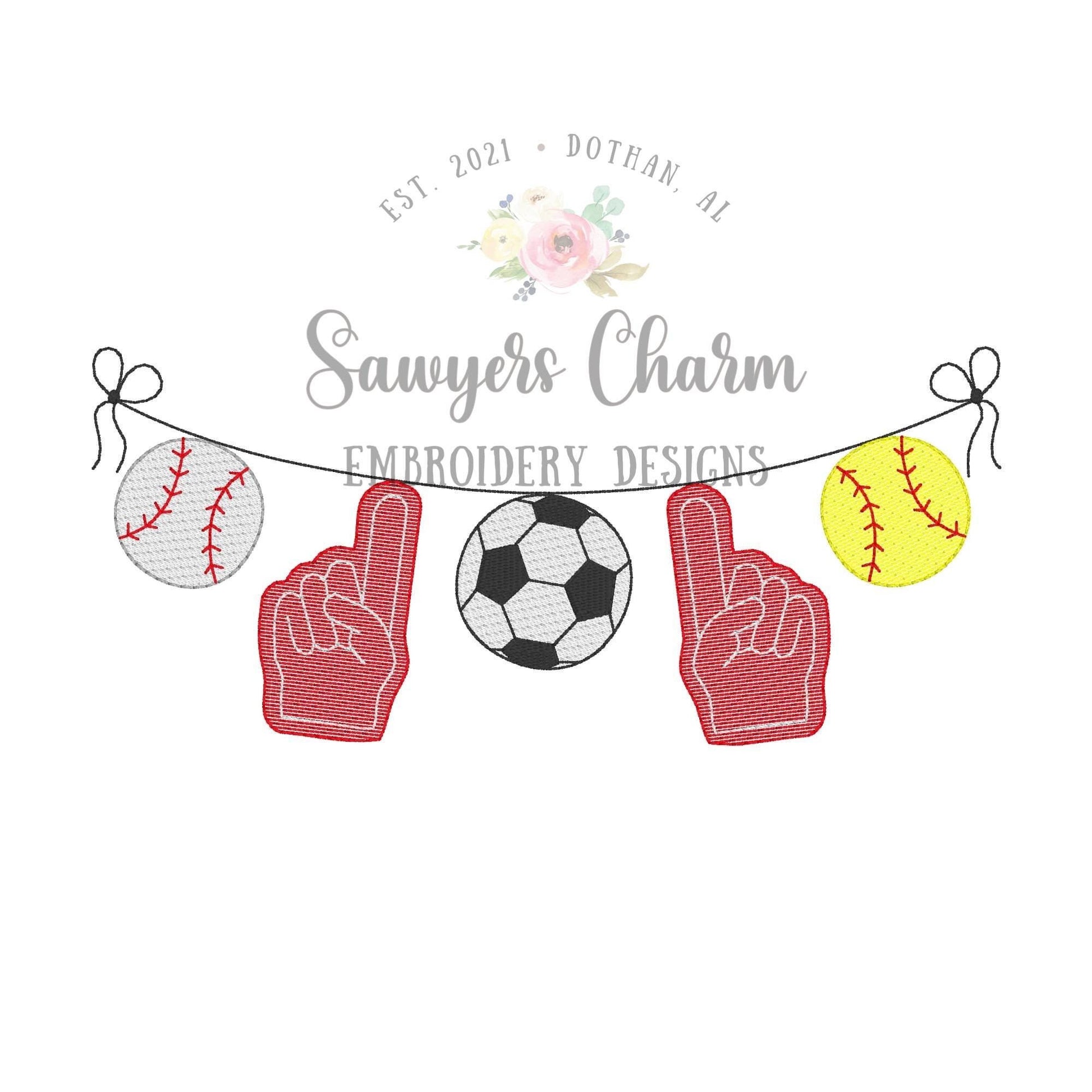 BUNDLE Sports balls with foam finger bunting banner sketch stitch machine embroidery design file, baseball, soccer, softball, fans, team