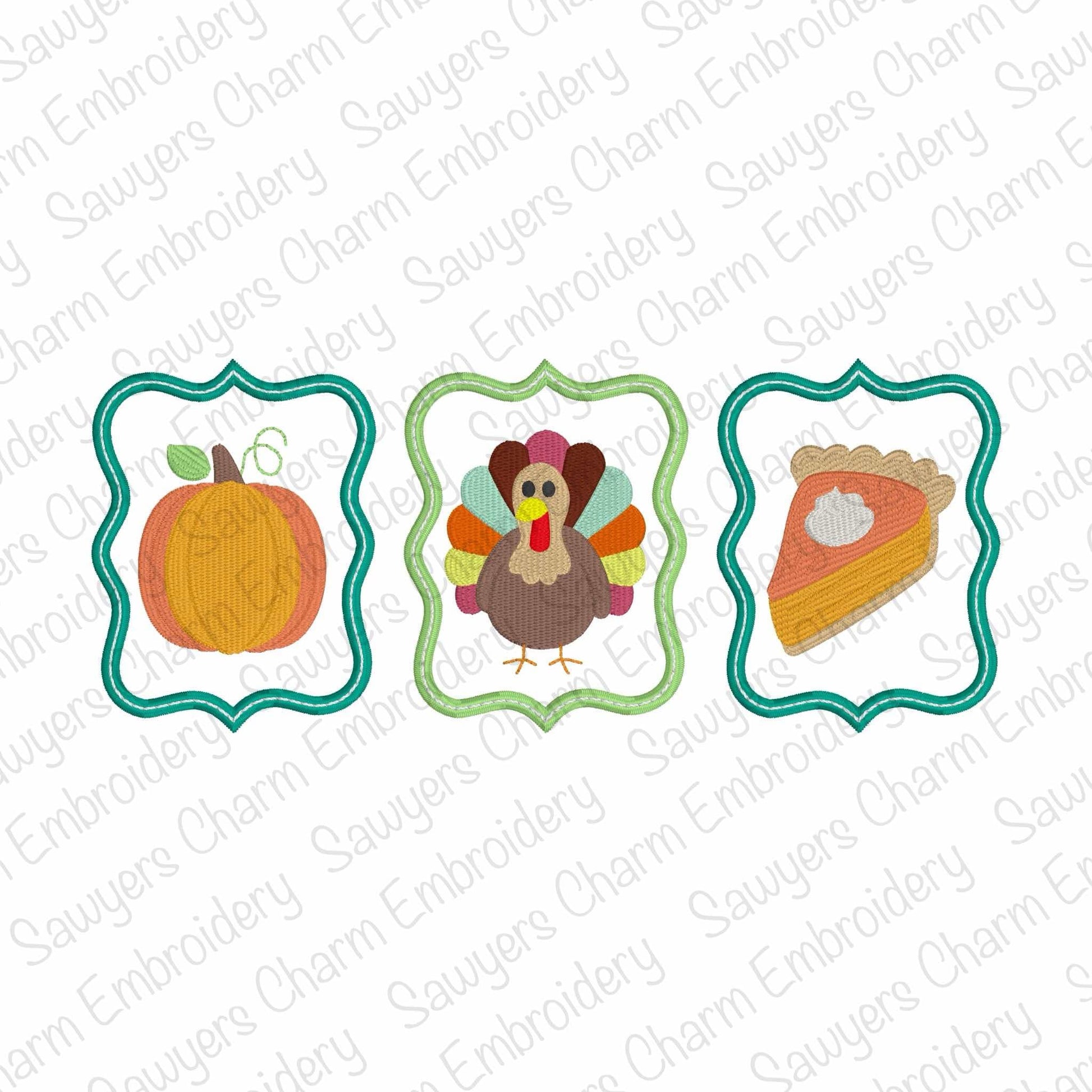 Thanksgiving frames trio satin stitch machine embroidery design, pumpkin, turkey, pumpkin pie mini fill, gobble, happy holidays, fall