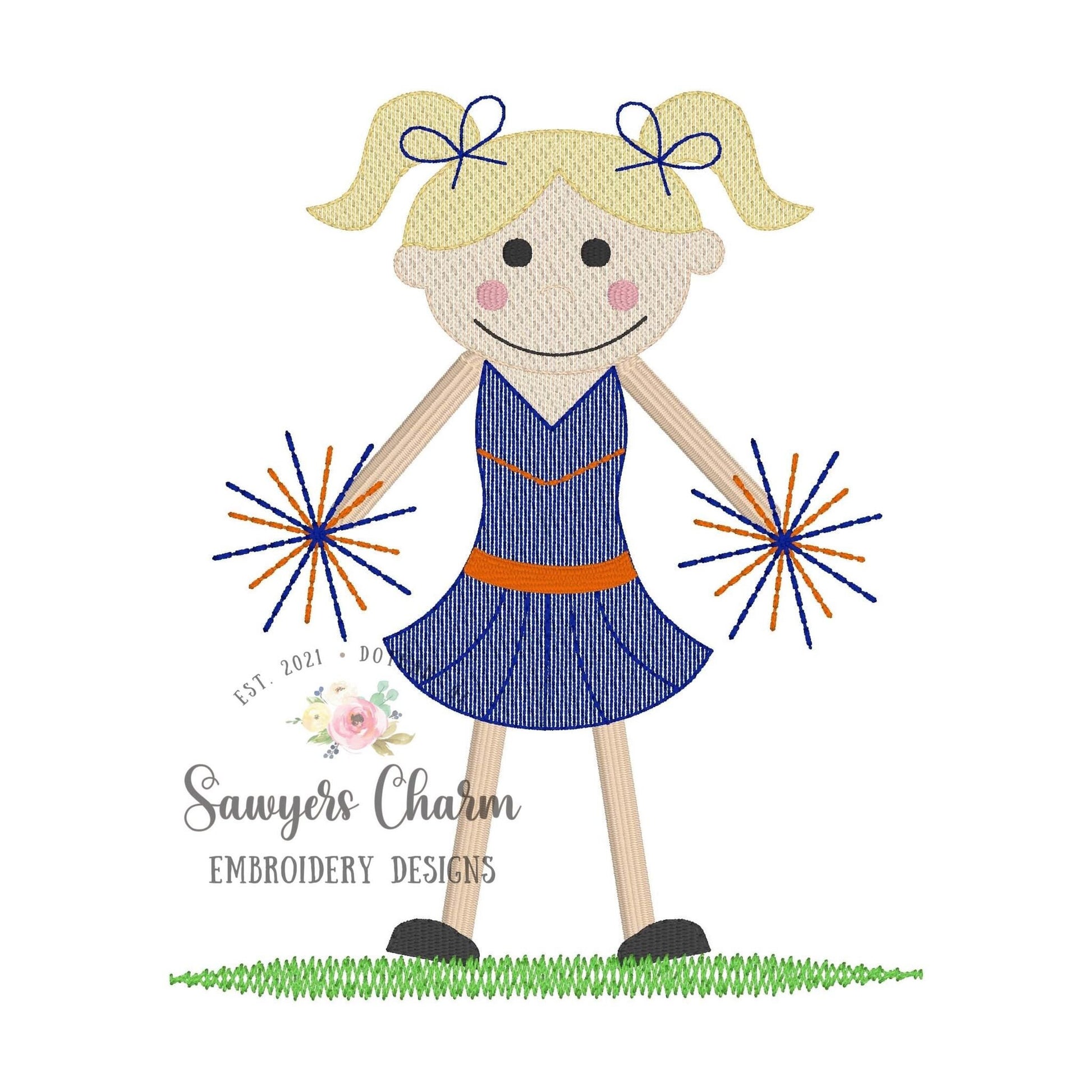 Cheerleader with pigtails & pompoms sketch stitch machine embroidery design file, quick stitch football field fall sports bow, cheerleading