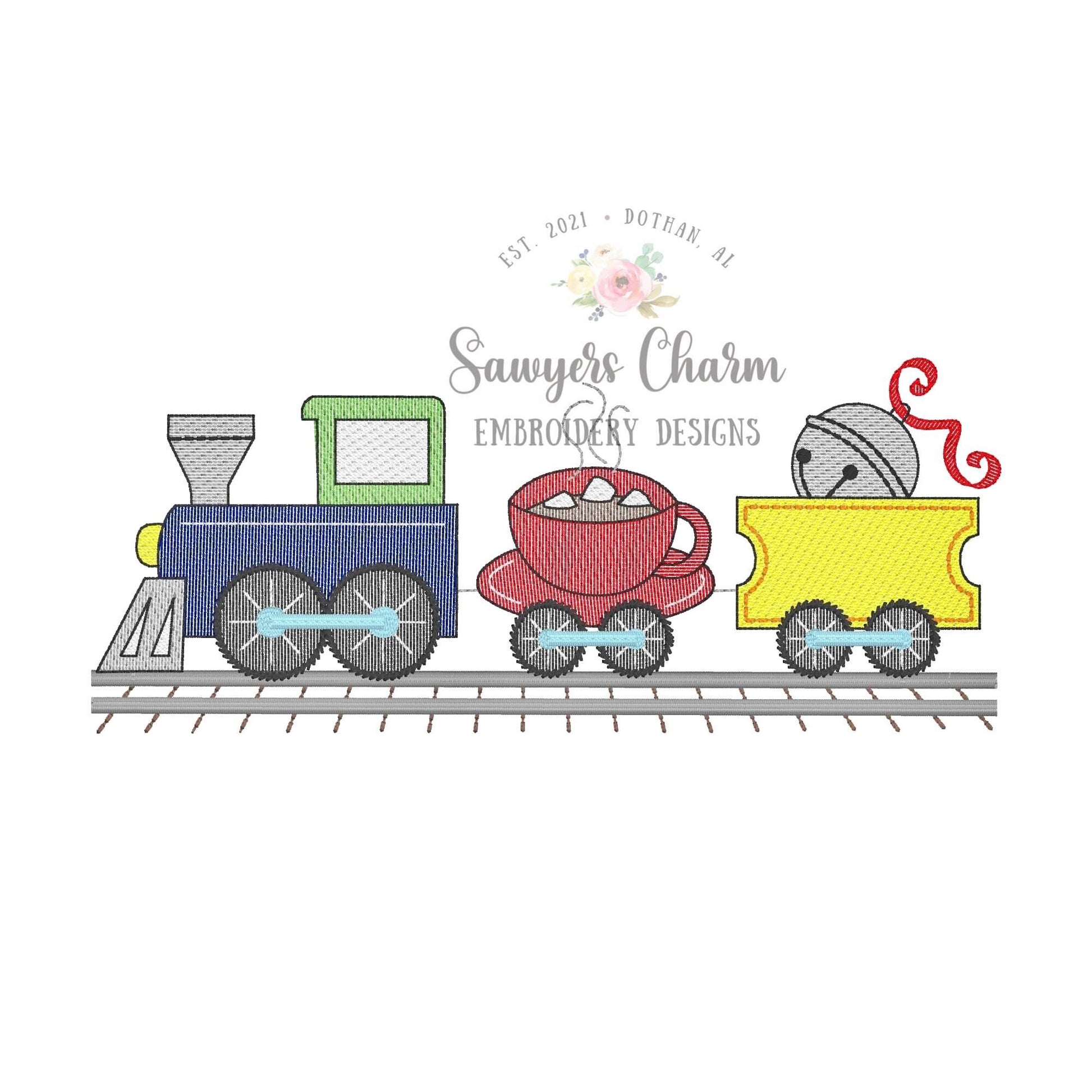 Christmas steam engine train, hot chocolate, believe ticket, jingle bell sketch stitch machine embroidery design file, happy holidays