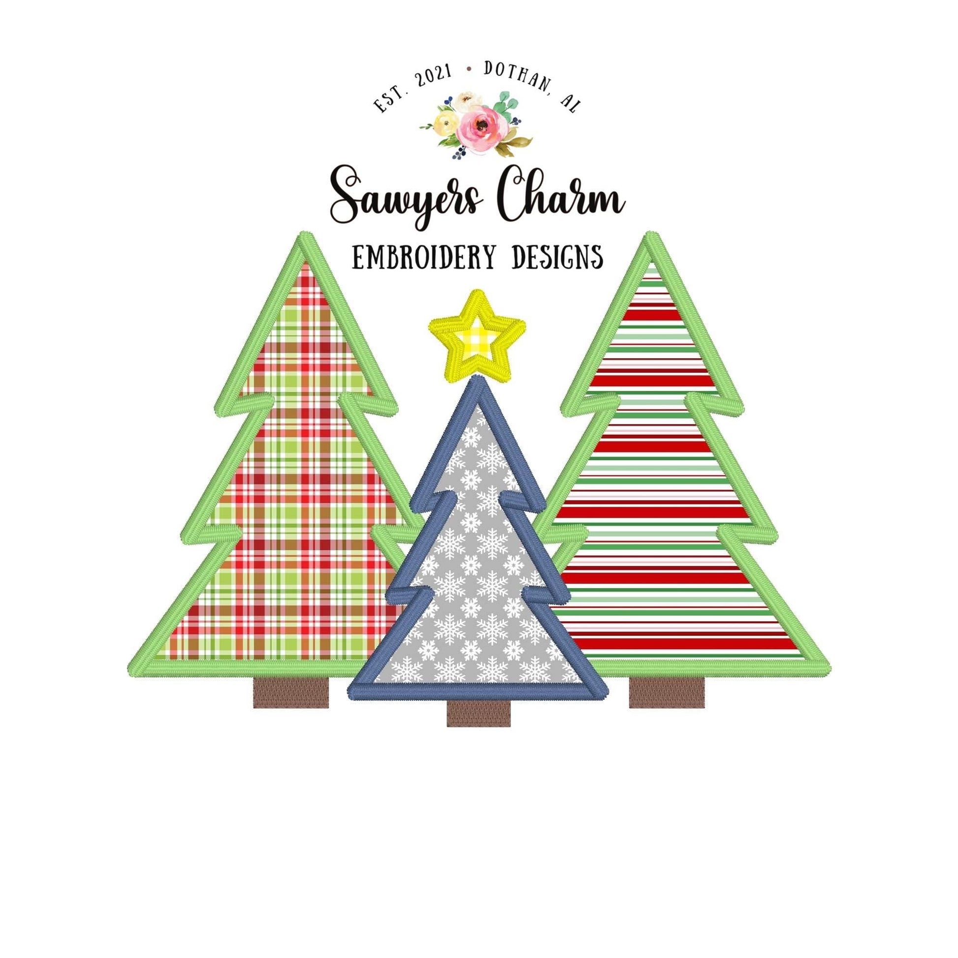 Christmas tree trio with star, satin stitch machine applique, embroidery design file, happy holidays, boho/woodland