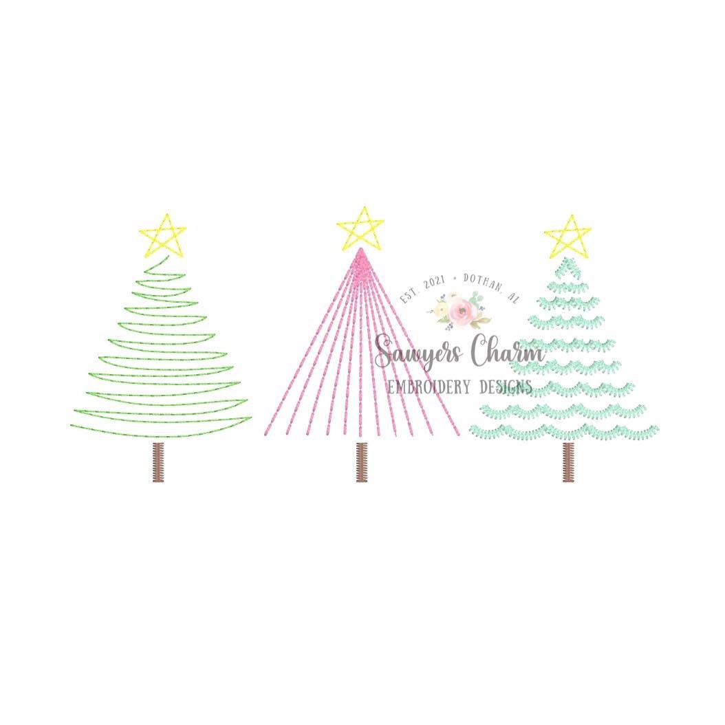 Christmas trees with stars trio, scribble vintage bean stitch, sketch machine embroidery design file, quick stitch, holidays, boho woodland