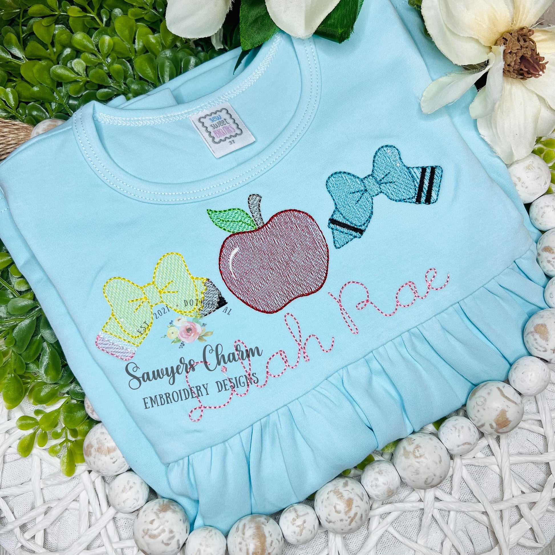 Crayon & pencil bow apple trio sketch stitch machine embroidery design file, quick stitch, colors, back to school, coquette, school supplies