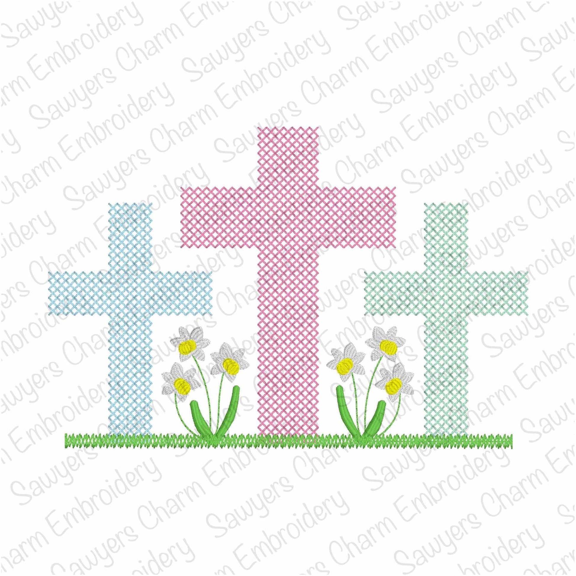 Cross-stitch cross trio machine embroidery design, vintage stitch, Easter Sunday, daffodil flowers
