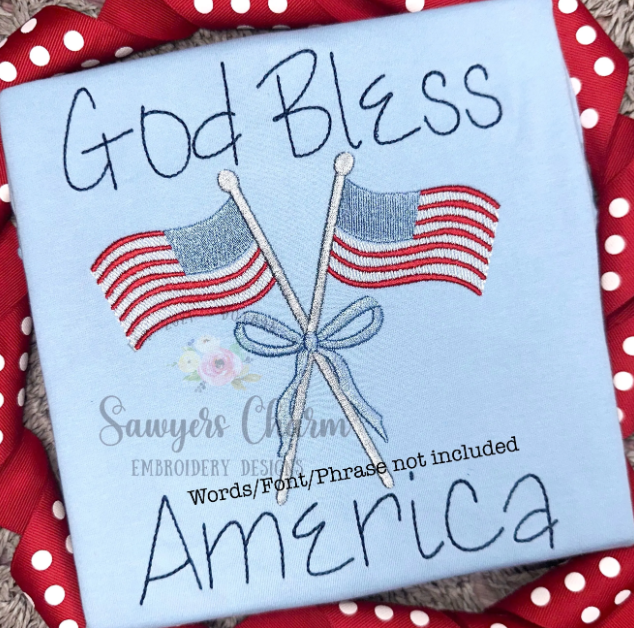 Crossed American flags with coquette bow, satin stitch machine embroidery design file, quick stitch, 4th of July, patriotic, stars & stripes