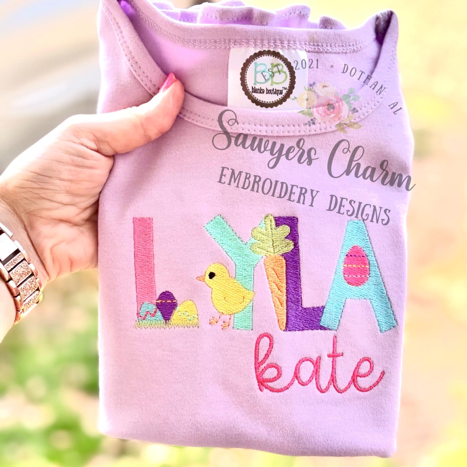 This embroidery font comes in several sizes....1.25", 1.5", 1.75", 2", 2.25", and 2.5". This is a fill stitch font with capital letters. Each letter comes with two choices, each having a different design. Some letters have chicks, some have eggs, some have an Easter basket, some tulips, some carrots, and some bunny ears making this the perfect font for Easter and spring! There is also a butterfly that can be added to the font. This will work for boys and girls since there are so many options and by changing the colors.