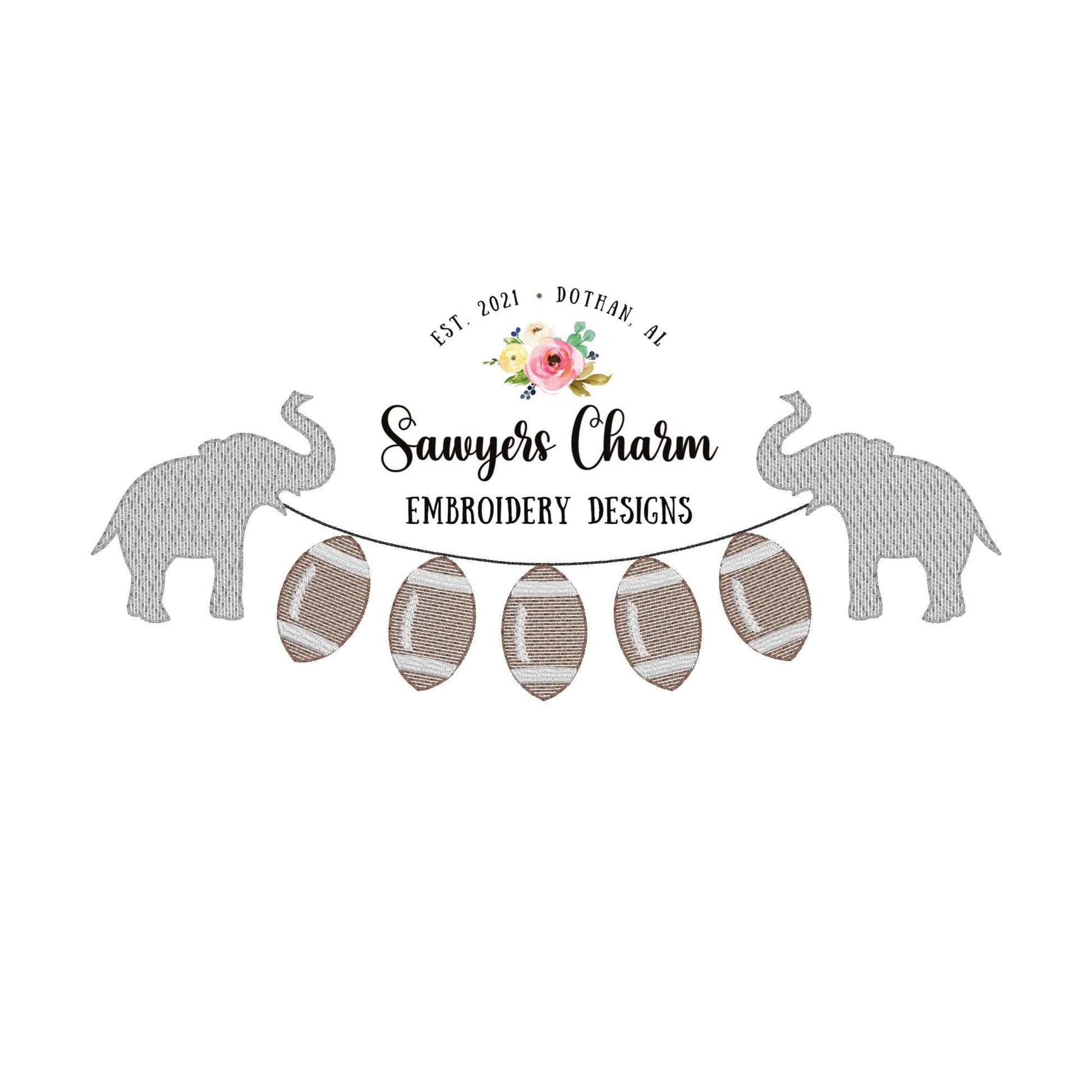 This embroidery file comes in 4 sizes.....5 inch wide, 6 inch wide, 5x7 and 8x8. You are getting the elephant with footballs bunting banner. It is a light fill sketch stitch embroidery design with bean stitch finishing details.