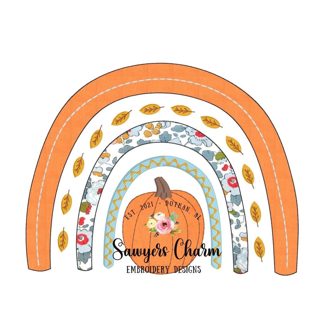Fall/autumn boho pumpkin rainbow with leaves machine applique design embroidery file, bean stitch, satin stitch, zigzag