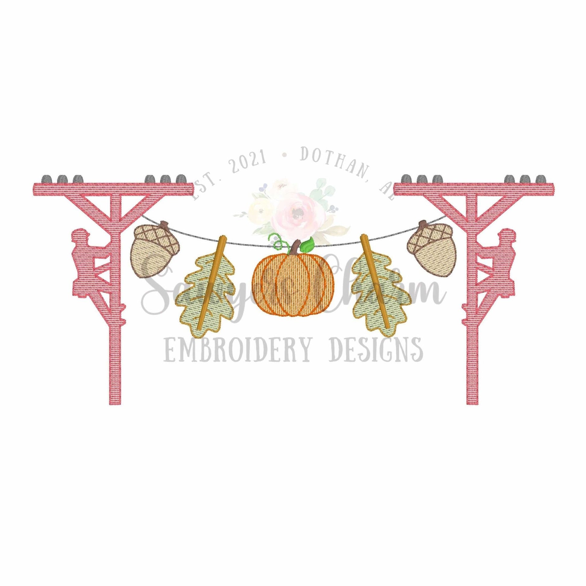 Fall thanksgiving lineman bunting banner sketch stitch machine embroidery design, quick stitch, power line pole leaves, acorn, pumpkin