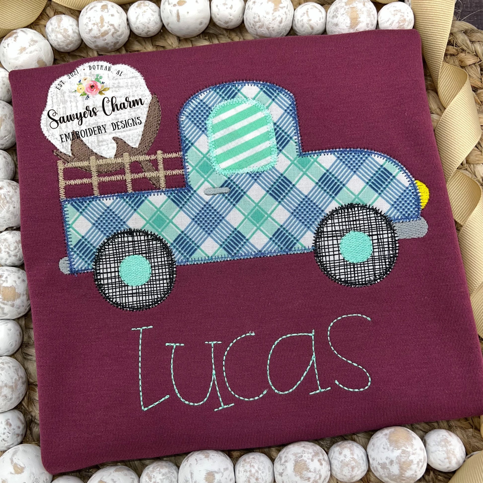 Fall vintage cotton boll pickup truck machine applique design embroidery file, zig zag stitch, with and without bow