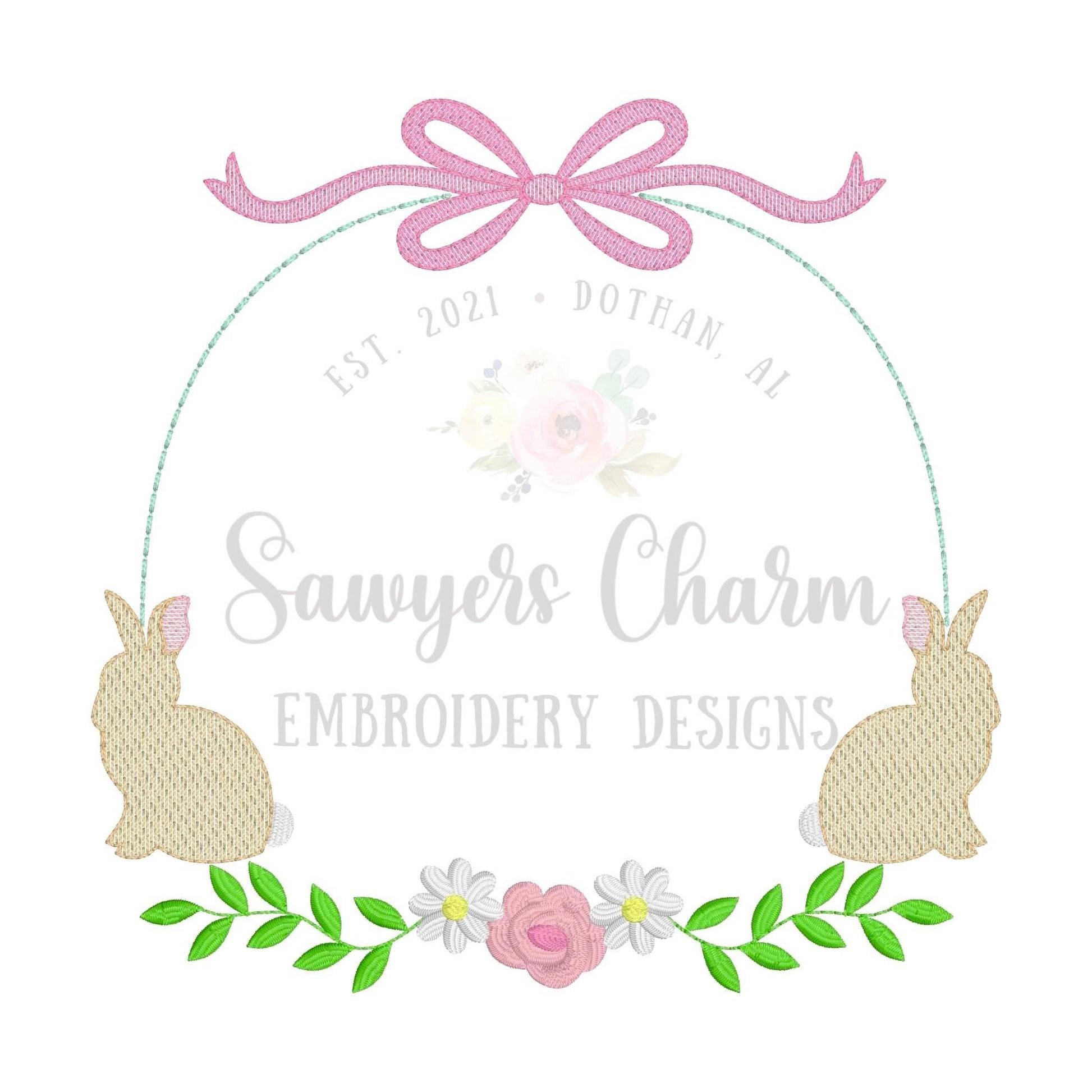 Floral bunny monogram frame with bow, satin stitch/sketch stitch machine embroidery design file, quick stitch, flowers, laurel swag, spring