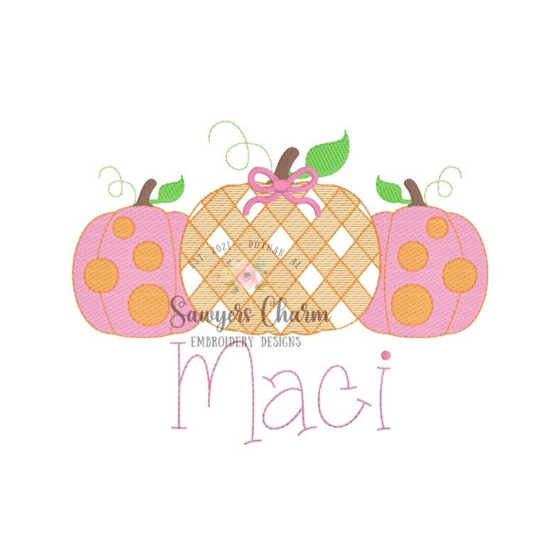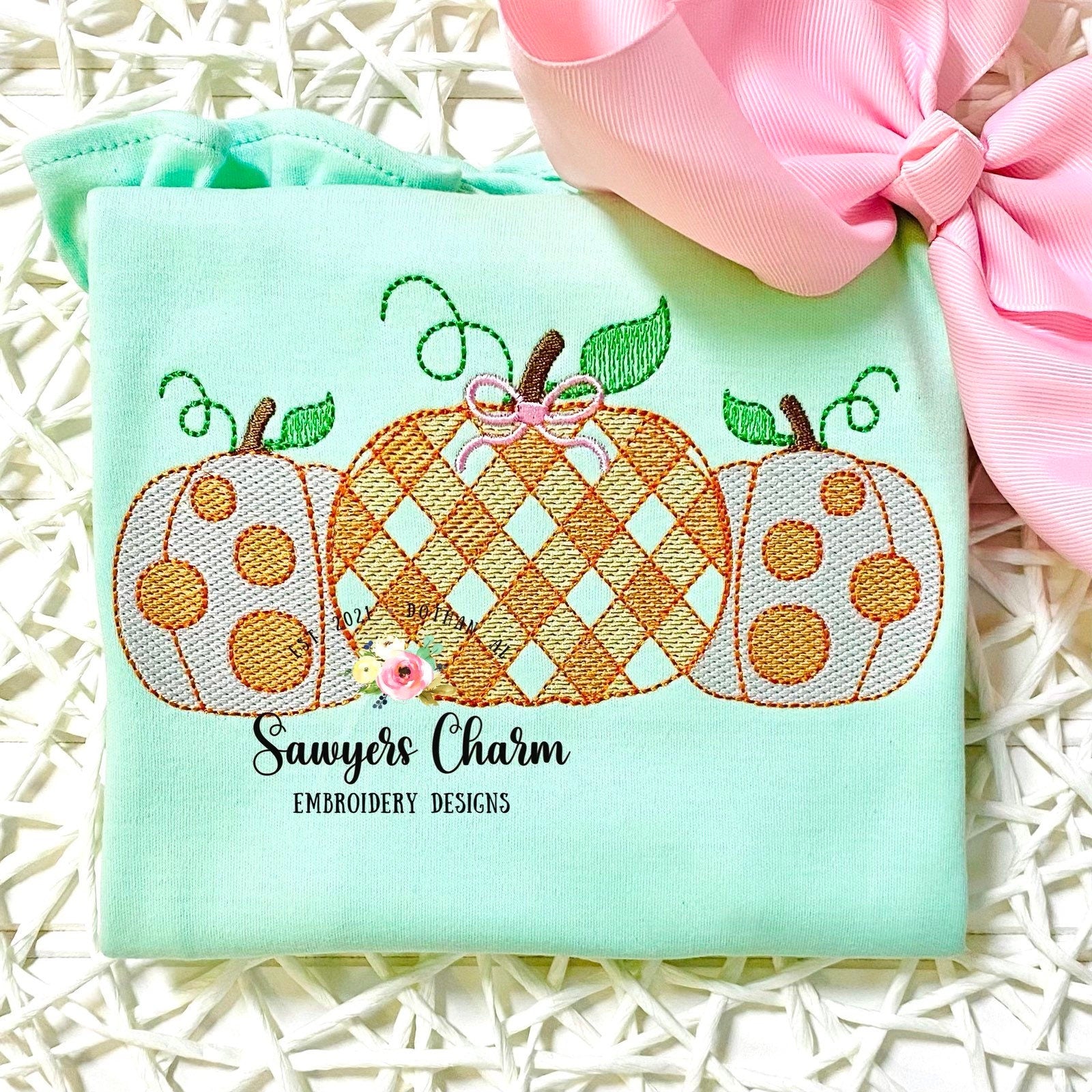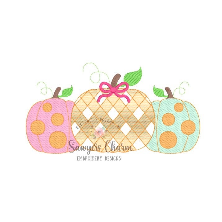 Gingham polka dot pumpkins trio with bow, sketch stitch embroidery design file, fall, halloween, fall leaves, pumpkin patch, quick stitch