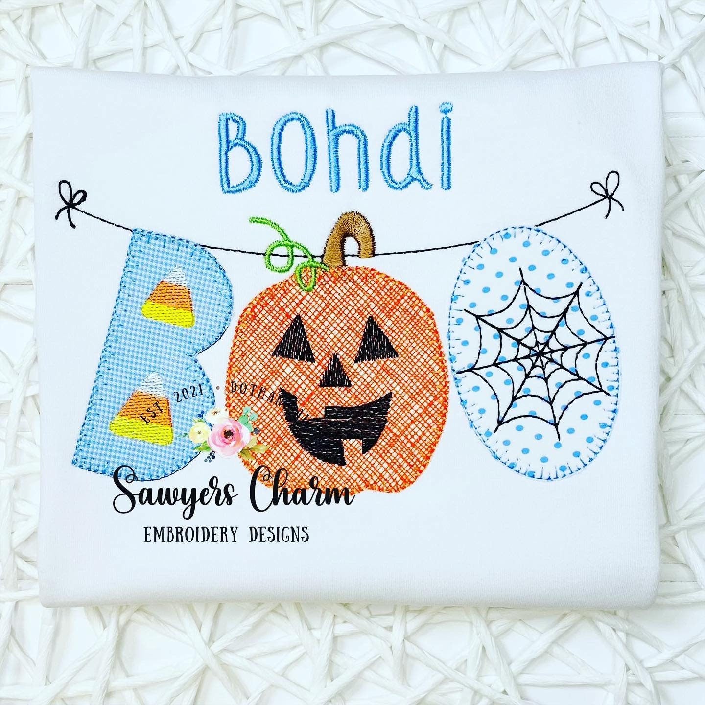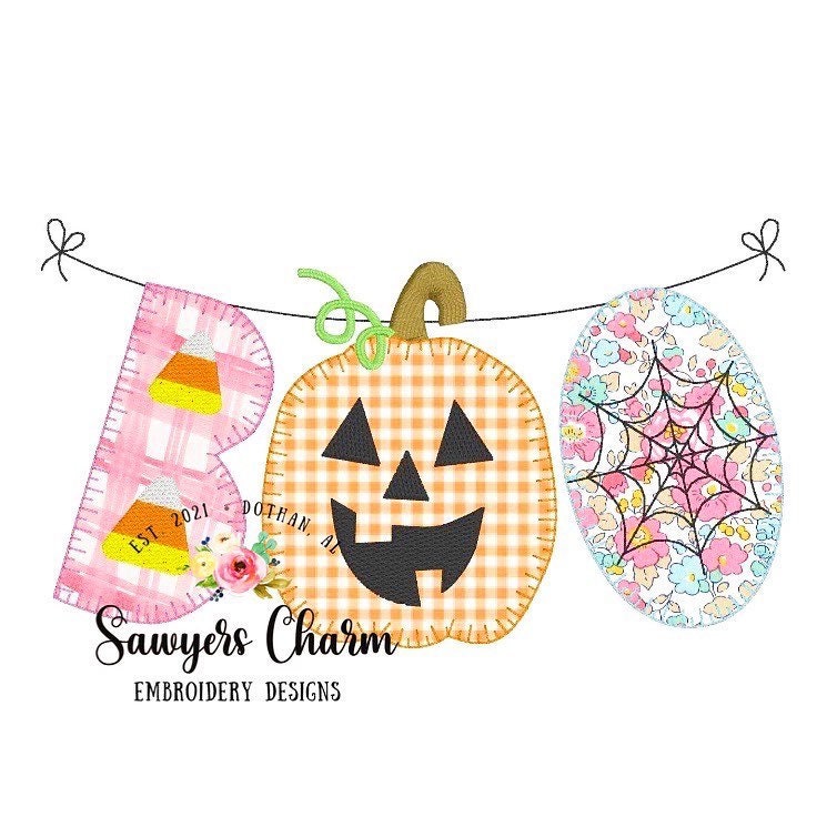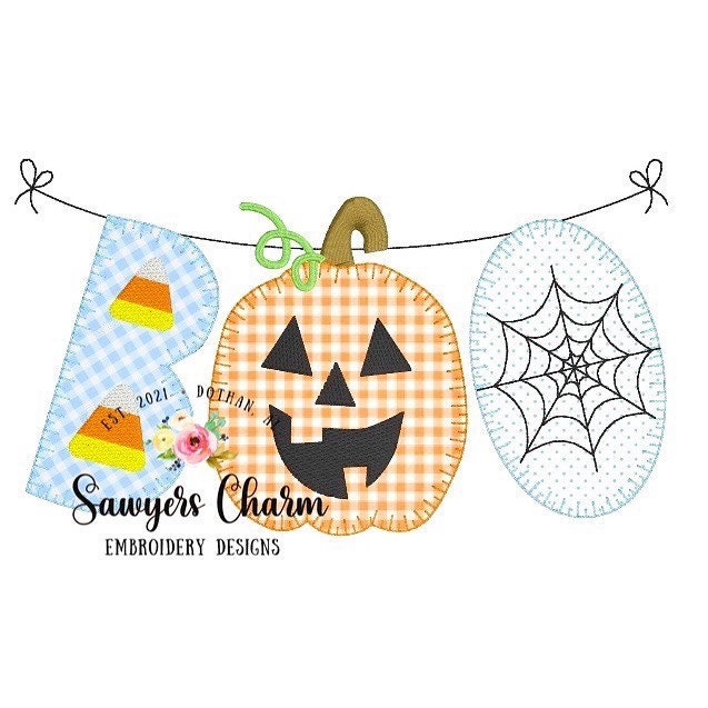 Halloween BOO jackolantern/candy corn/spider web spooky bunting banner blanket stitch machine applique embroidery design file, pumpkin patch