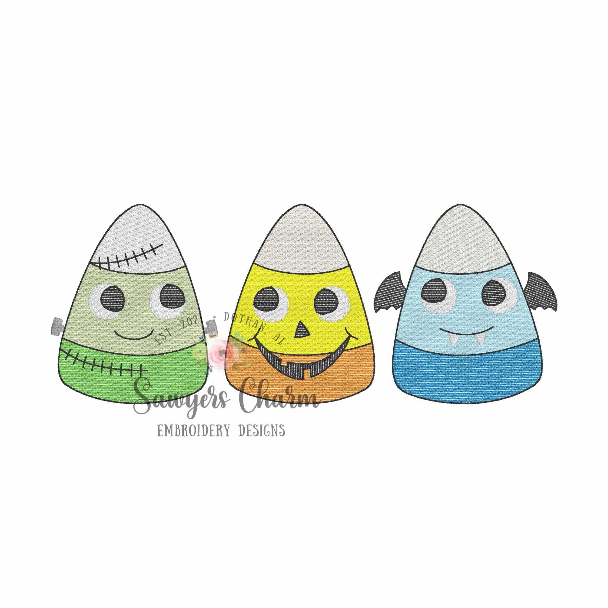 Halloween candy corn faces trio sketch stitch applique, machine embroidery design, frankenstein, jackolantern, bat, spooky season