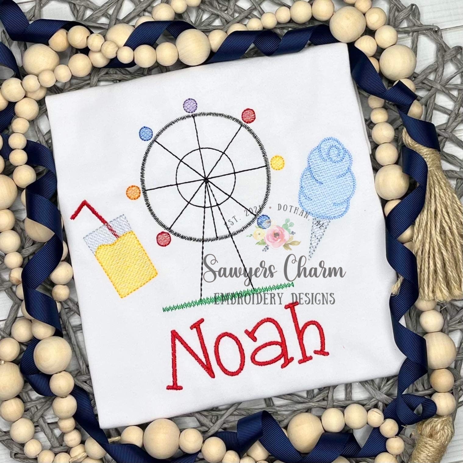 Lemonade, ferris wheel, cotton candy sketch stitch trio machine embroidery design file, county fair, outdoors, summer, rides, fair food