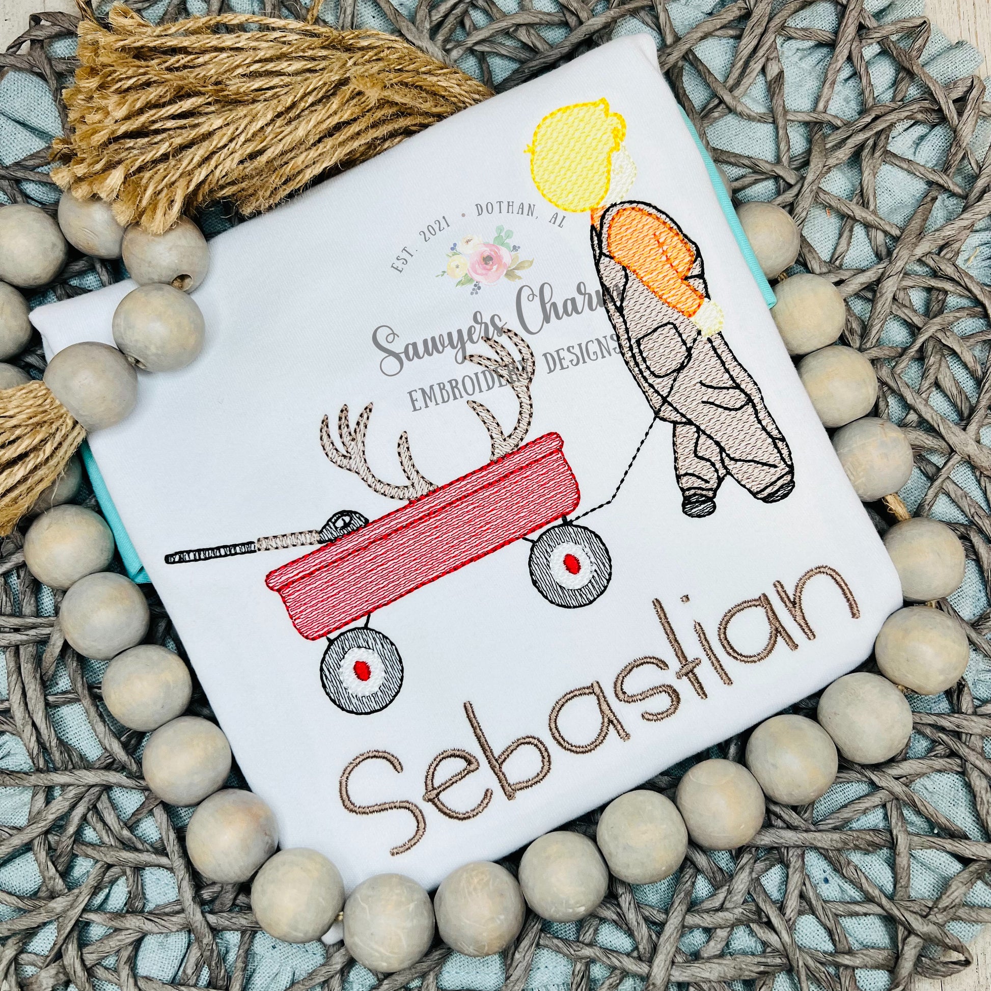 Little boy deer hunting pulling wagon sketch stitch machine embroidery design file, buck antlers, fall, outdoor hunt, overalls